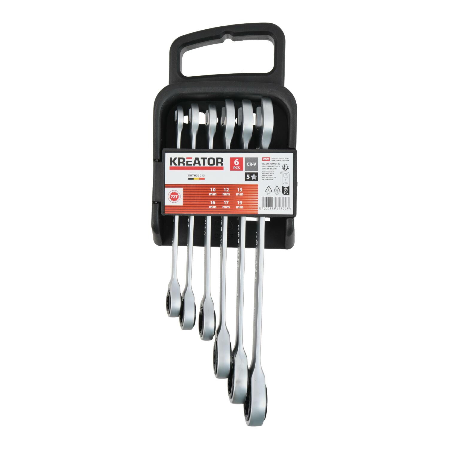 Šis 6 daļu komplekts ar atvērtiem un reverse mehānisma atslēgām no KREATOR ir ideāls rīks, lai ātri un viegli pievilktu jebkuru uzgriezni vai skrūvi. Katra atslēga ir atšķirīgas garuma, un tai ir viens reverse mehānisms un viens atvērto galu tādā pašā izmērā ar lielāko izmēru 19 mm. Komplektā izmantots augstas kvalitātes hromā vanādijs.