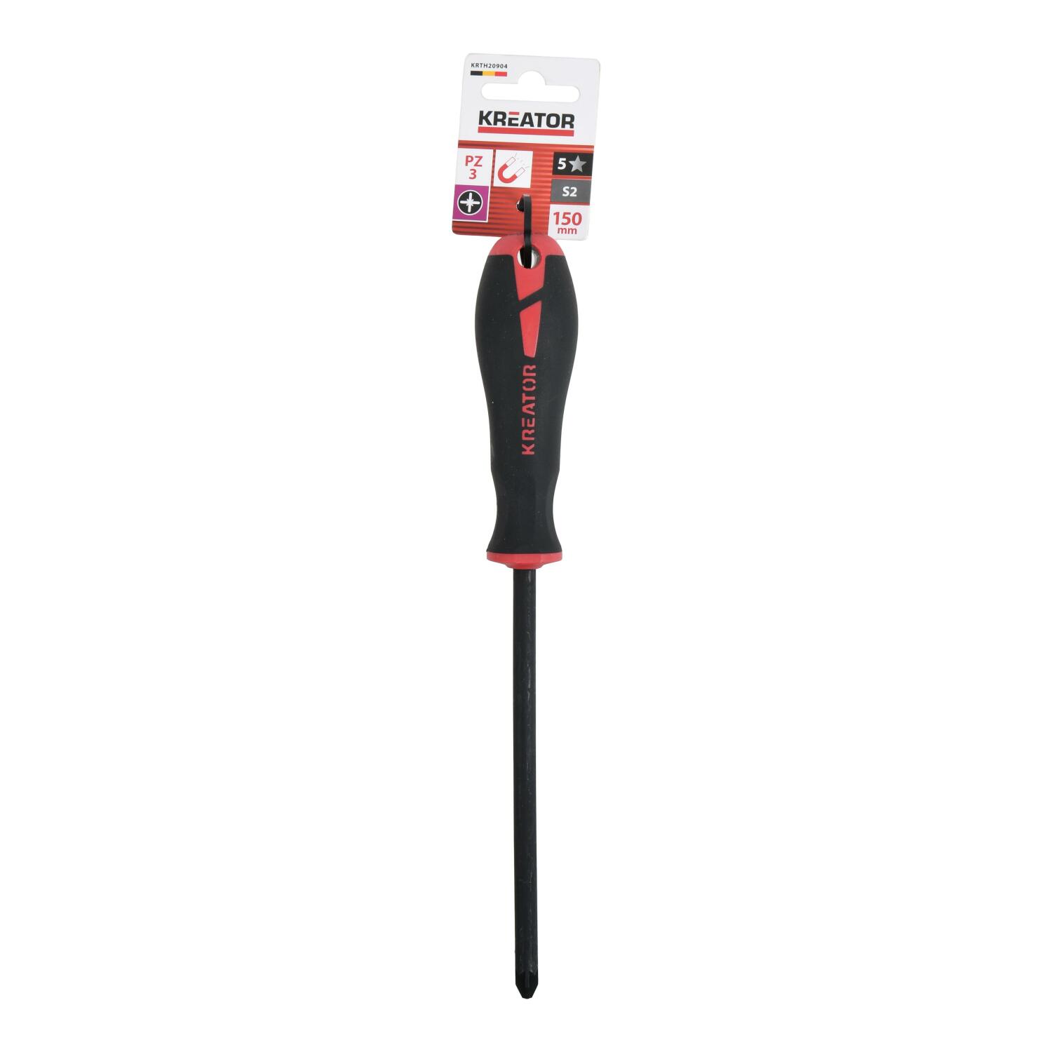 KREATOR KRTH20904 pozidriv skrūvgriezis ar 150 mm garu asti ir izgatavots no augstas kvalitātes S2 tērauda. Magnētiskā galva paātrina skrūvju ieskrūvēšanu, savukārt mīkstā, neslīdošā roktura dizains nodrošina drošu satveri. Roktura konstrukcijā ir iebūvēts acu piestiprināšanai, kas nodrošina ērti uzglabāšanu.