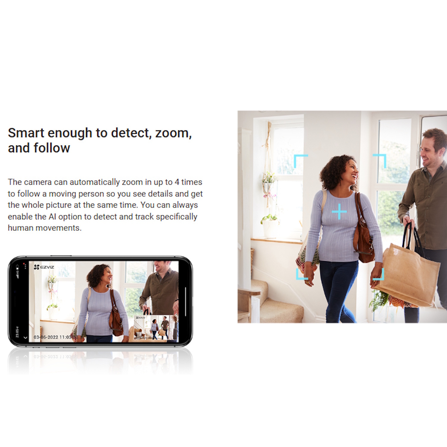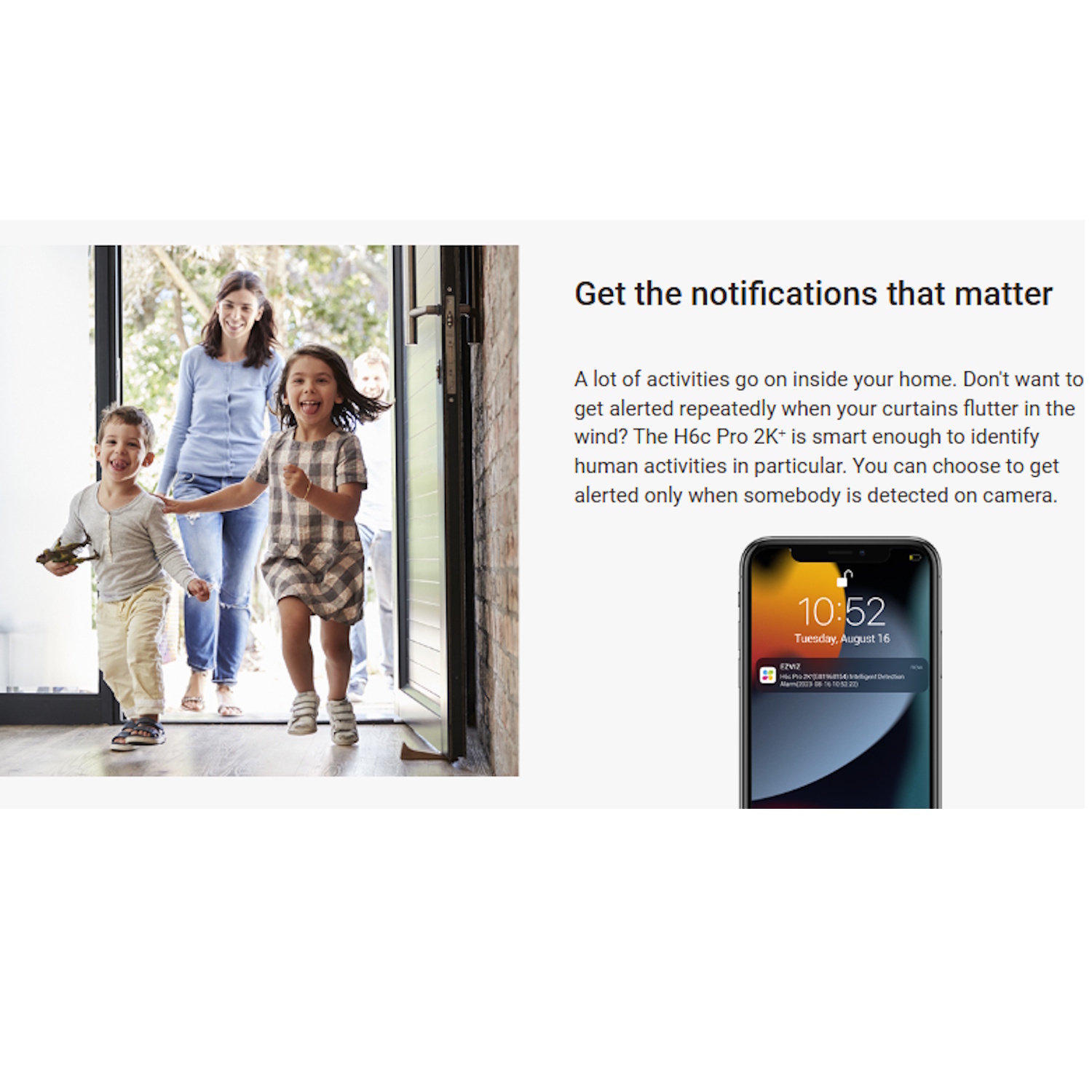Kompakts un stilīgs dizains padara H6c Pro 2K⁺ par ideālu risinājumu jebkurai telpai — bērnistabai, viesistabai vai birojam. Viss, kas tev nepieciešams, lai vienmēr būtu informēts par notiekošo, ir tavā tālrunī caur EZVIZ lietotni.