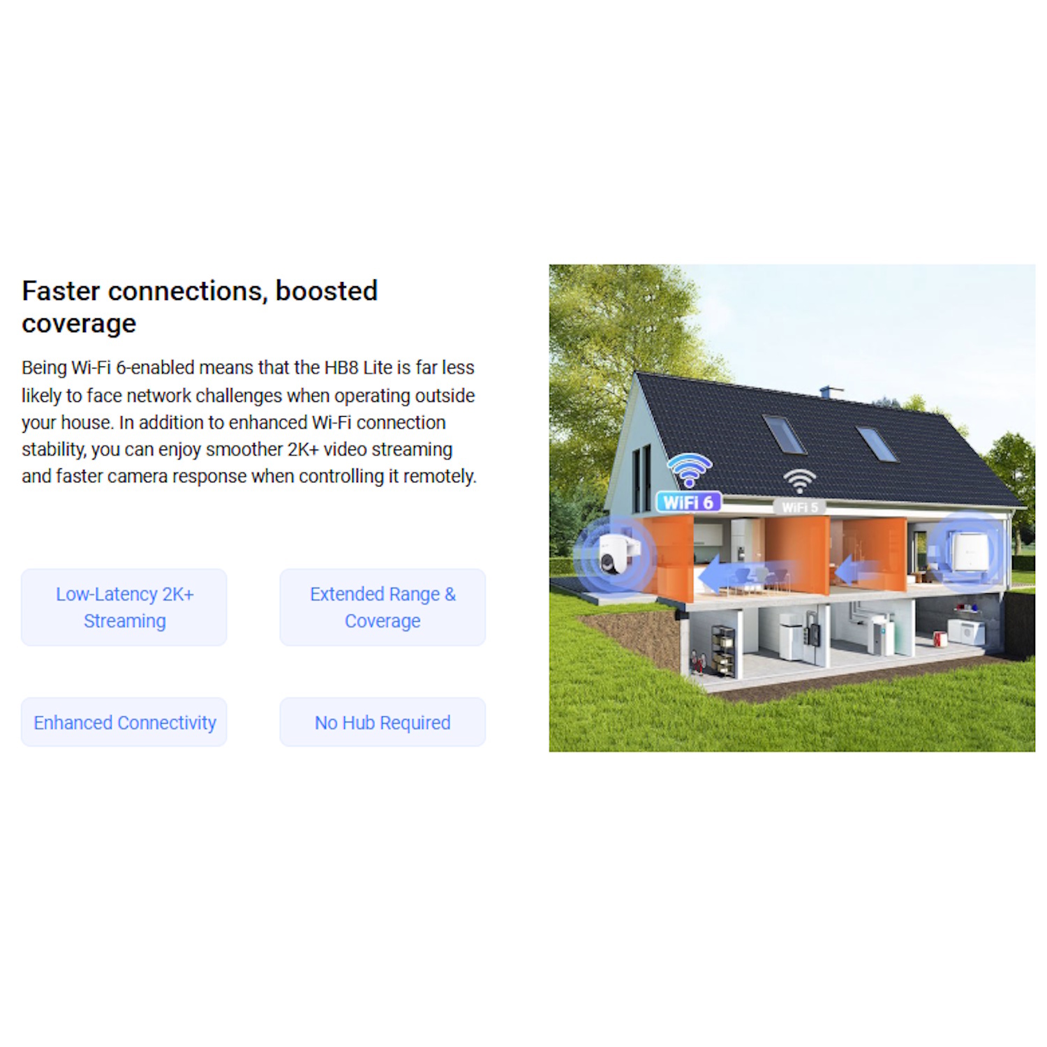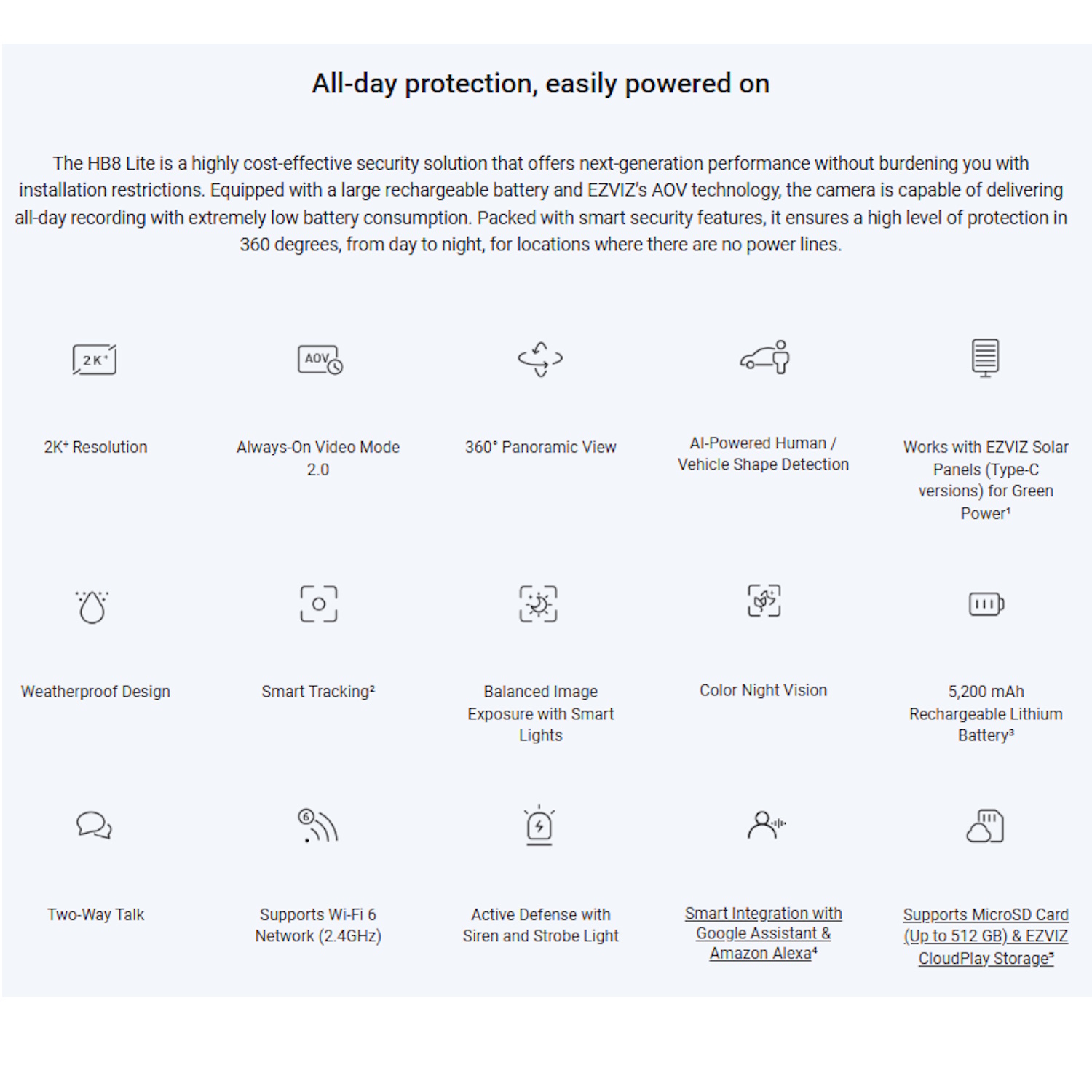 Ezviz HB8 Lite 2K⁺ nodrošina pilnīgu bezvadu drošības risinājumu: vieda, izturīga un viegli uzstādāma kamera ar pilnu pārklājumu un skaidru nakts redzi.