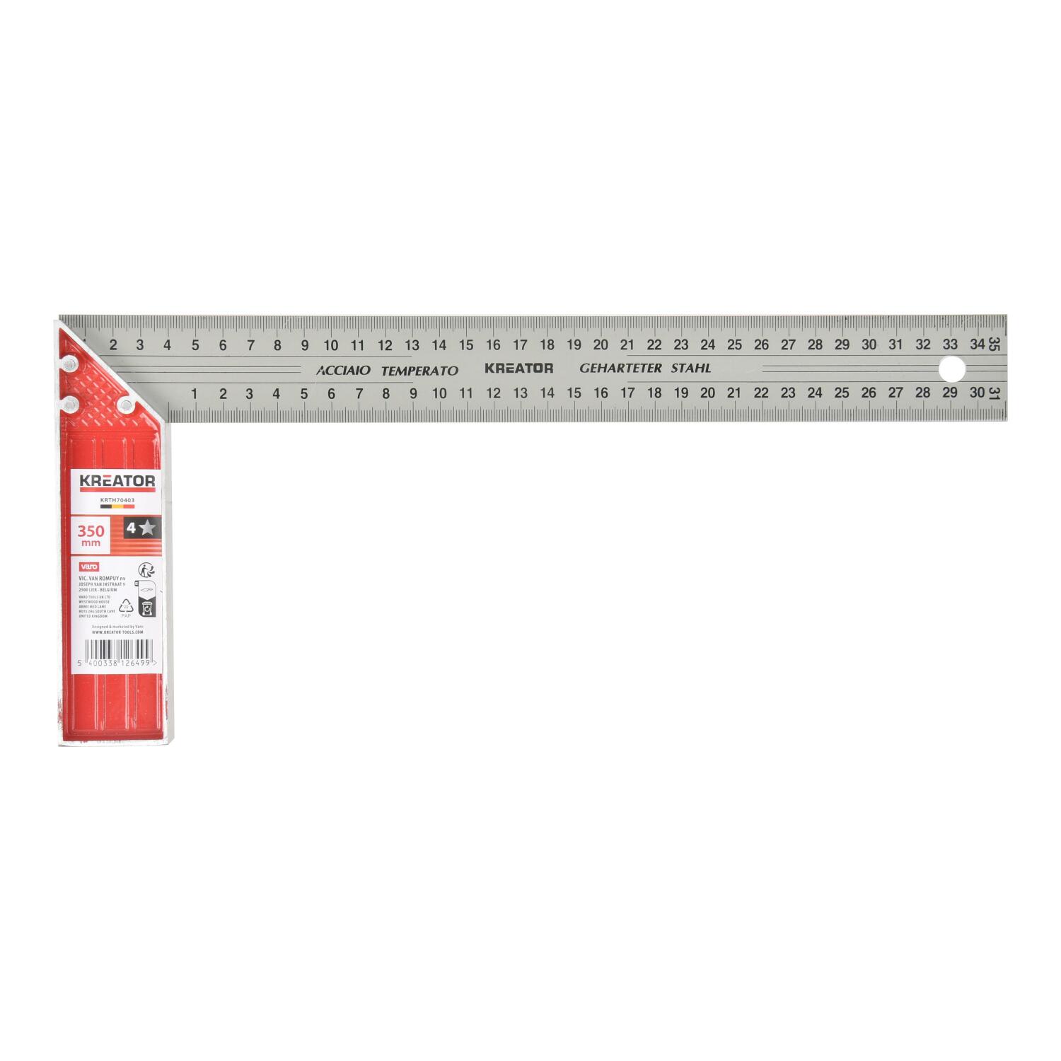 KREATOR KRTH70403 galdnieka leņķis ir 350 mm garš un izgatavots no cietā tērauda. To var izmantot 90° leņķu mērīšanai un atzīmēšanai. Turklāt tam ir iebūvēta piek hanging acs, kas nodrošina ērtu uzglabāšanu.