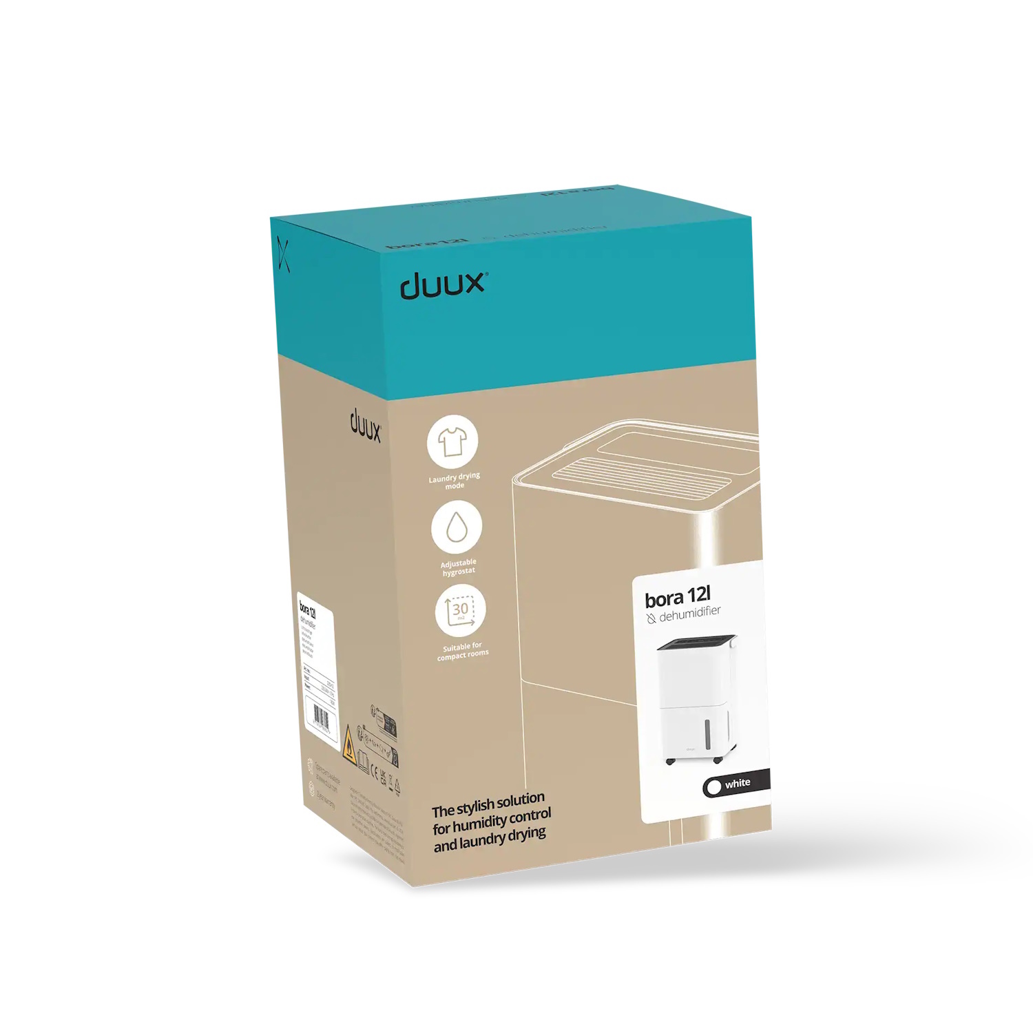 DUUX Bora Power (DXDH12) ir kompakts, energoefektīvs gaisa mitruma savācējs ar jaudu 169 W, kas diennaktī spēj savākt līdz 12 litriem liekā mitruma. Tas efektīvi novērš pelējuma un baktēriju veidošanos un nodrošina veselīgu mikroklimatu telpās līdz 30 m². Iebūvētais higrostats (30–80 %) automātiski uztur optimālu mitruma līmeni, savukārt aktivētās ogles filtrs palīdz attīrīt gaisu no smakām un dūmiem. Pateicoties veļas žāvēšanas režīmam, Bora ne tikai atjauno komfortablu vidi, bet arī kļūst par ekonomisku alternatīvu tradicionālajam žāvētājam, ietaupot līdz pat 50 % enerģijas.