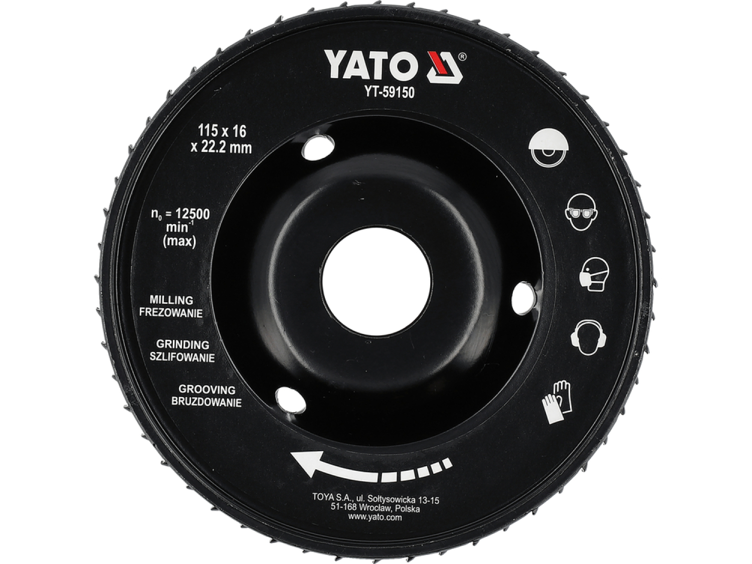 YATO YT-59150 ir 115 mm diametra zāģa rīve disks, kas izgatavots no oglekļa tērauda un paredzēts ātrai un efektīvai koksnes, aerētā betona un gipsa plākšņu apstrādei. 16 mm biezā asmens nodrošina precīzu un stabilu griešanu, bet sacietējusī un lakotā virsma palielina instrumenta izturību.