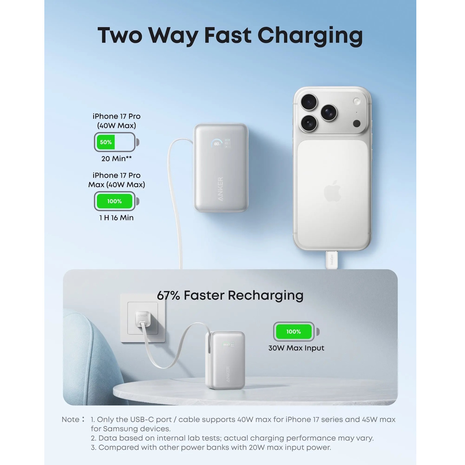 Šis ir kompakts premium klases ārējais uzlādes akumulators ar lielu ietilpību un spēcīgu uzlādes jaudu — 10000 mAh 45 W ar iebūvētu USB-C konektoru un USB-A pieslēgvietu, balts A1638H21 Anker. Tas apvieno modernu, ātrās uzlādes tehnoloģiju ar stilīgu, pārnēsājamu korpusu, nodrošinot uzticamu enerģijas rezervi gan ceļā, gan ikdienas lietošanā. Anker risinājums ļauj ātri uzlādēt viedtālruņus, planšetes un citus USB-ierīču saturus, vienlaikus saglabājot drošību, mobilitāti un efektivitāti.