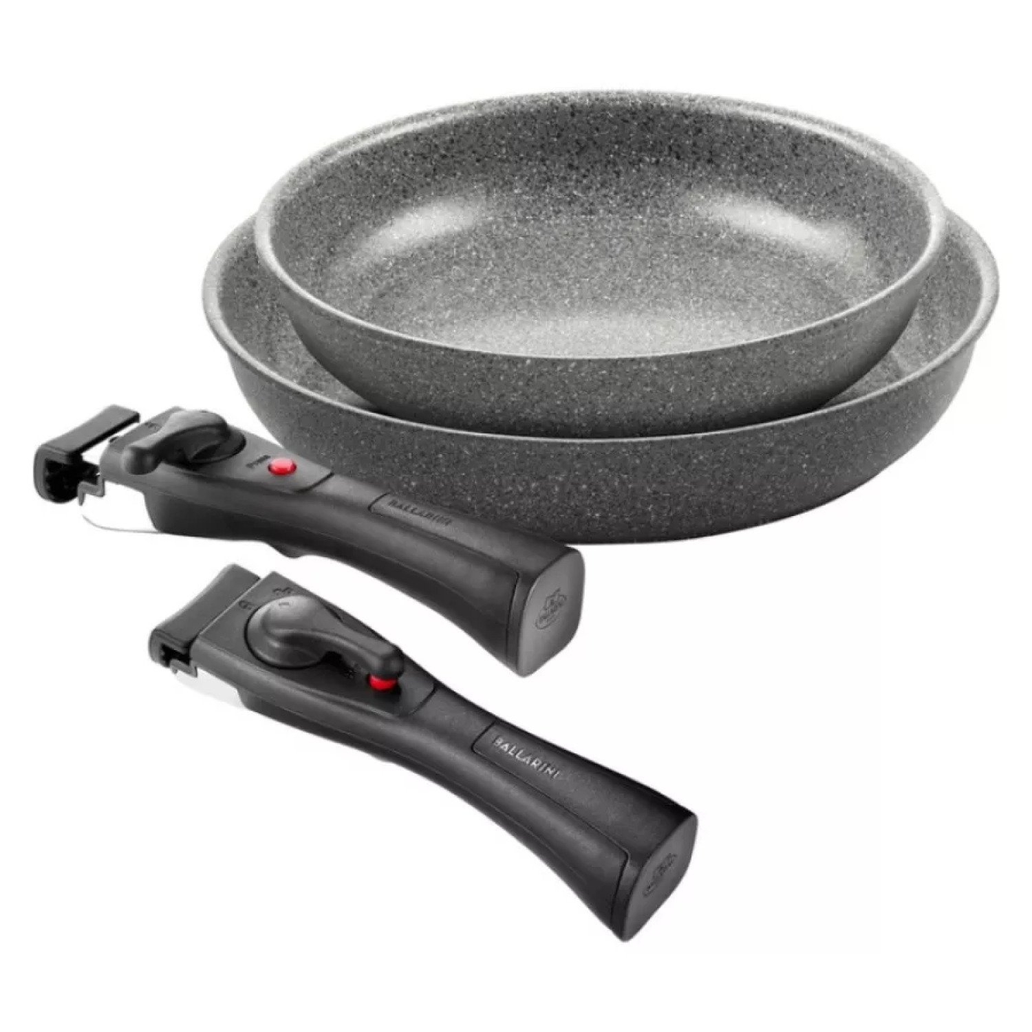 Pannu komplekts ar noņemamu rokturi. Komplektā ir 2 pannas un 2 rokturi, kas ir ideāli piemērots visām plītīm, ieskaitot indukcijas plītis.