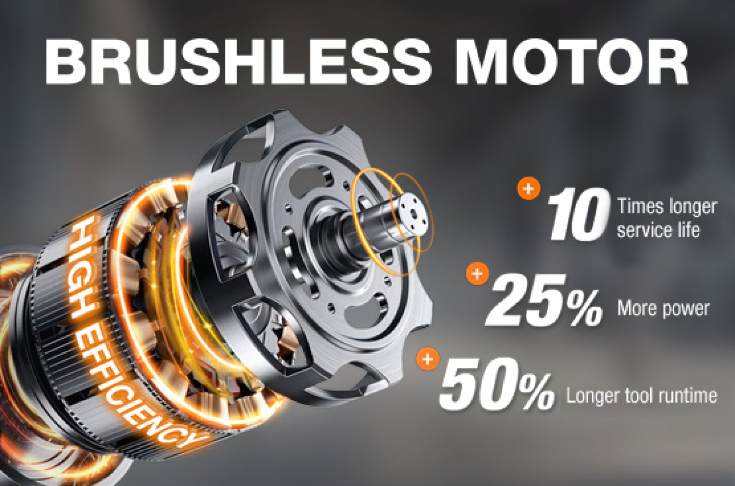 Bezoglīšu motors nodrošina lielu jaudu ar mazāku enerģijas patēriņu, ļaujot strādāt līdz pat 50% ilgāk ar vienu akumulatora uzlādi. SDS ķēdes spriegošanas sistēma