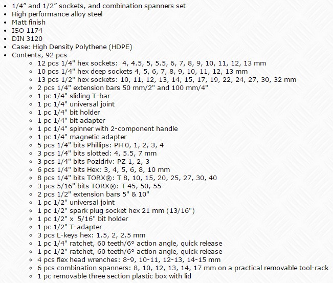 • 6gab. kombinētās atslēgas: 8, 10, 12, 13, 14, 17mm , turētājā