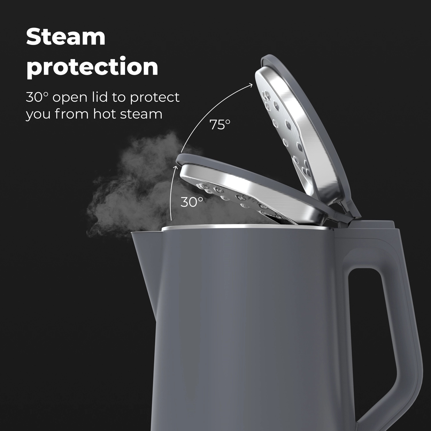 EK4 modelim ir bezšuvju nerūsējošā tērauda iekšējā bļoda bez plastmasas kontakta ar ūdeni, automātiska izslēgšanās, aizsardzība pret sauso darbību un tvaika aizsardzība. Tējkanna darbojas klusi, ātri uzvāra ūdeni un iederas mūsdienu virtuvēs ar savu tumši pelēko, minimālistisko dizainu.