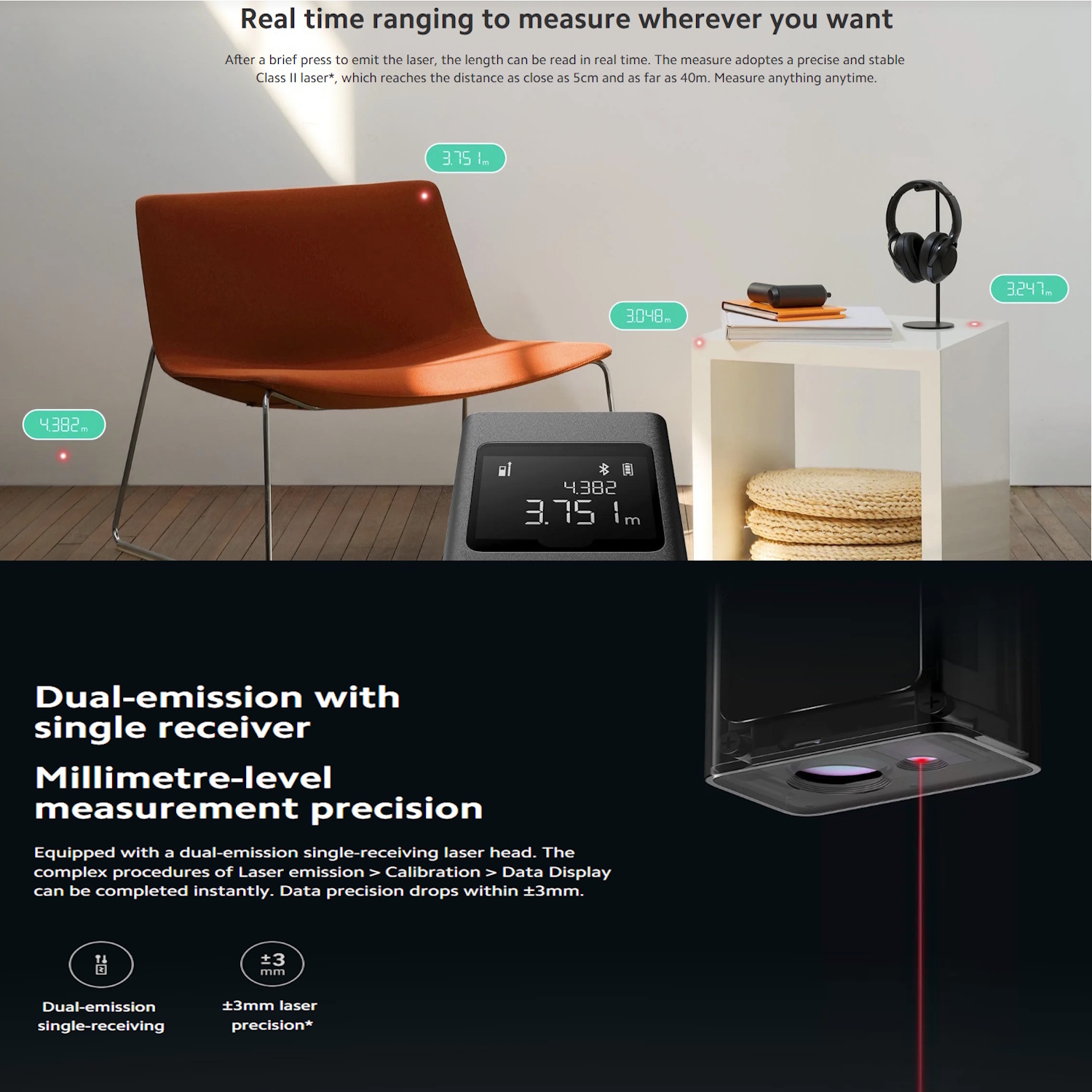 Līdz 40 m mērīšanas diapazons → plašs pielietojums iekštelpās un ārpus tām
