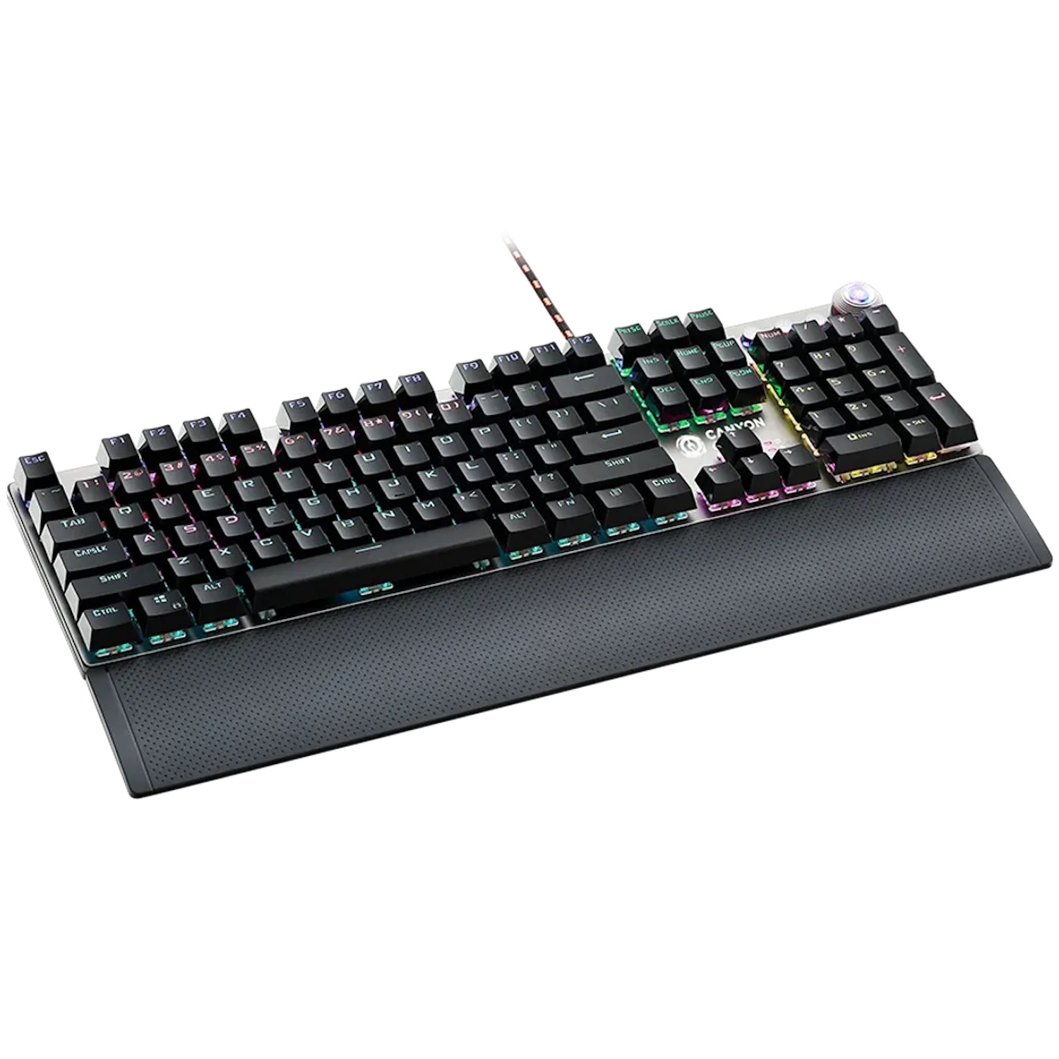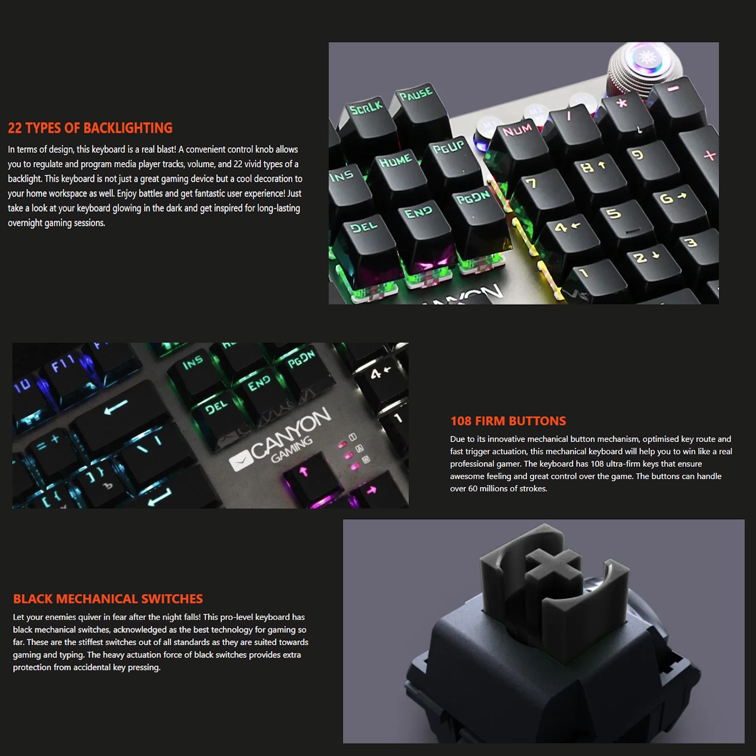 Canyon Nightfall GK-7 ir pilna izmēra vadu mehāniskā spēļu klaviatūra ar 108 taustiņiem, kas paredzēta ilgām un intensīvām spēļu sesijām. Tā piedāvā 22 apgaismojuma efektus, magnētisku plaukstas balstu un izturīgu 1,6 m pinuma kabeli, nodrošinot komfortu, stabilitāti un vizuāli izteiksmīgu spēļu vidi.