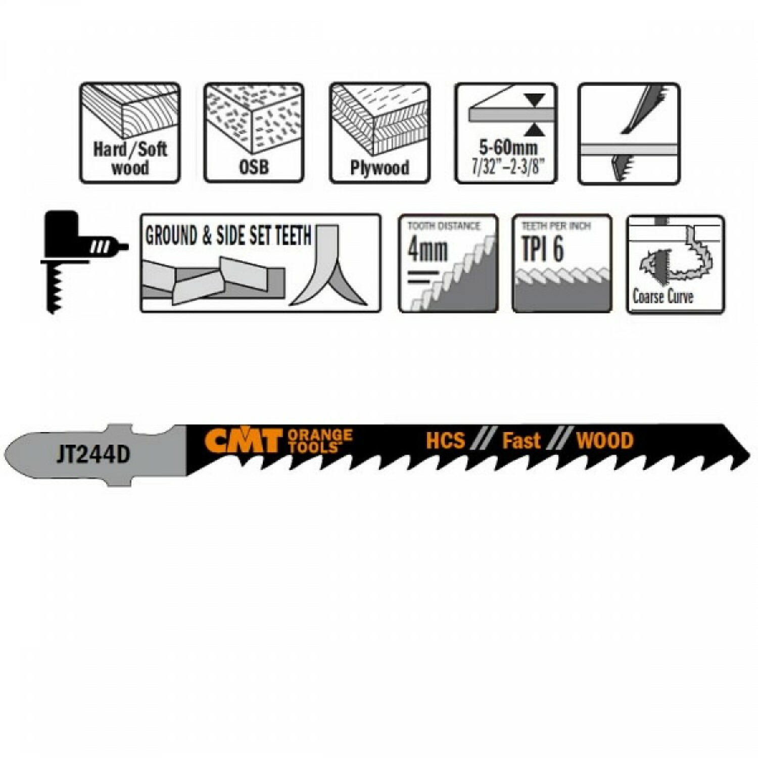 JT244D-5 Figūrzāģa asmens kokam HCS, 75x4mm, CMT, JT244D-5, 5 gab., Z6TPI