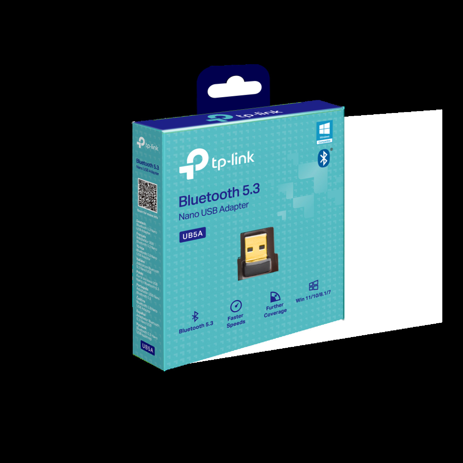 TP-Link UB5A ir Bluetooth 5.3 Nano USB adapteris ar USB 2.0 saskarni, kas nodrošina stabilu un ātru bezvadu saziņu starp datoru un Bluetooth ierīcēm, vienlaikus atbalstot līdz 7 ierīcēm vienlaikus un ērti ievietojams jebkurā USB portā bez traucējoša izmēra.