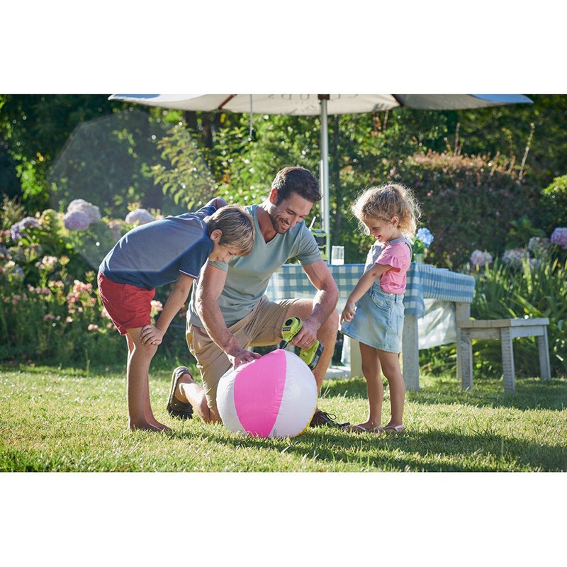 Riepu un objektu piesūknēšanai ar gaisa spiedienu līdz pat 150 mārc. kvadrātcollā/10,3 bāri/1030 kilopaskāli. 50 cm augstspiediena šļūtene un jebkurā spiediena režīmā ērti regulējami vadības elementi. 3 konusveida adapteri, bumbas adata un šaurā riepas ventiļa adapteris. Komplektācijā neietilpst akumulators un lādētājs. ONE+ sistēmas daļa.