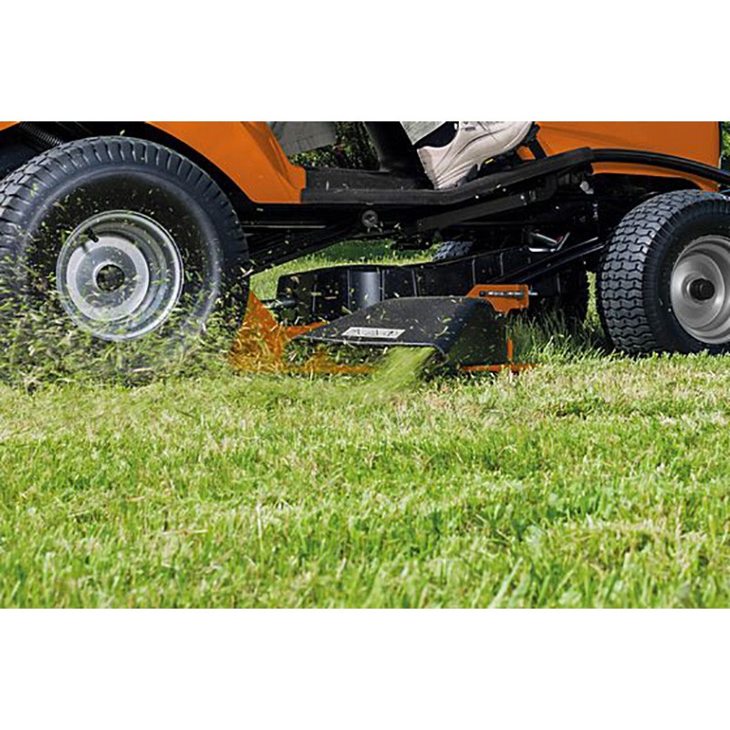 Izmantojot STIHL RT 4097 S zāliena traktoru, lielas zāles platības ātri un viegli tiks nopļautas pat nožogotos dārzos. Mašīnas pļaušanas platums ir 95 cm, un tā apvienojumā ar sānu izmešanas funkciju nodrošina ātru zālāju darbu līdz 6000 m². STIHL RT 4097 S ir elektromagnētiskā griezēja asmeņu sajūgs, tāpēc zāliena traktora asmeņus vadības panelī var viegli ieslēgt un izslēgt. Viena pedāļa piedziņa nodrošina traktora veiklību un ērtu vadību.