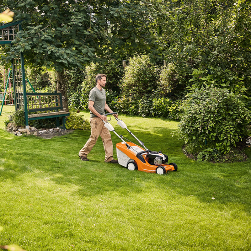 PiedziņaSTIHL zāles pļāvēju riteņu piedziņa padara darbu vieglāku, jo īpaši lielākās platībās un slīpumos. |