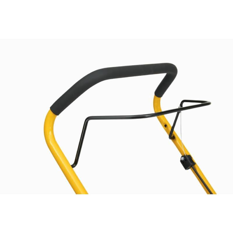 Komfortu darba procesā garantē salokāms ergonomiskais un mīkstais rokturis, bet centrālā svira ļauj regulēt pļaušanas augstumu tikai ar vienas rokas kustību.