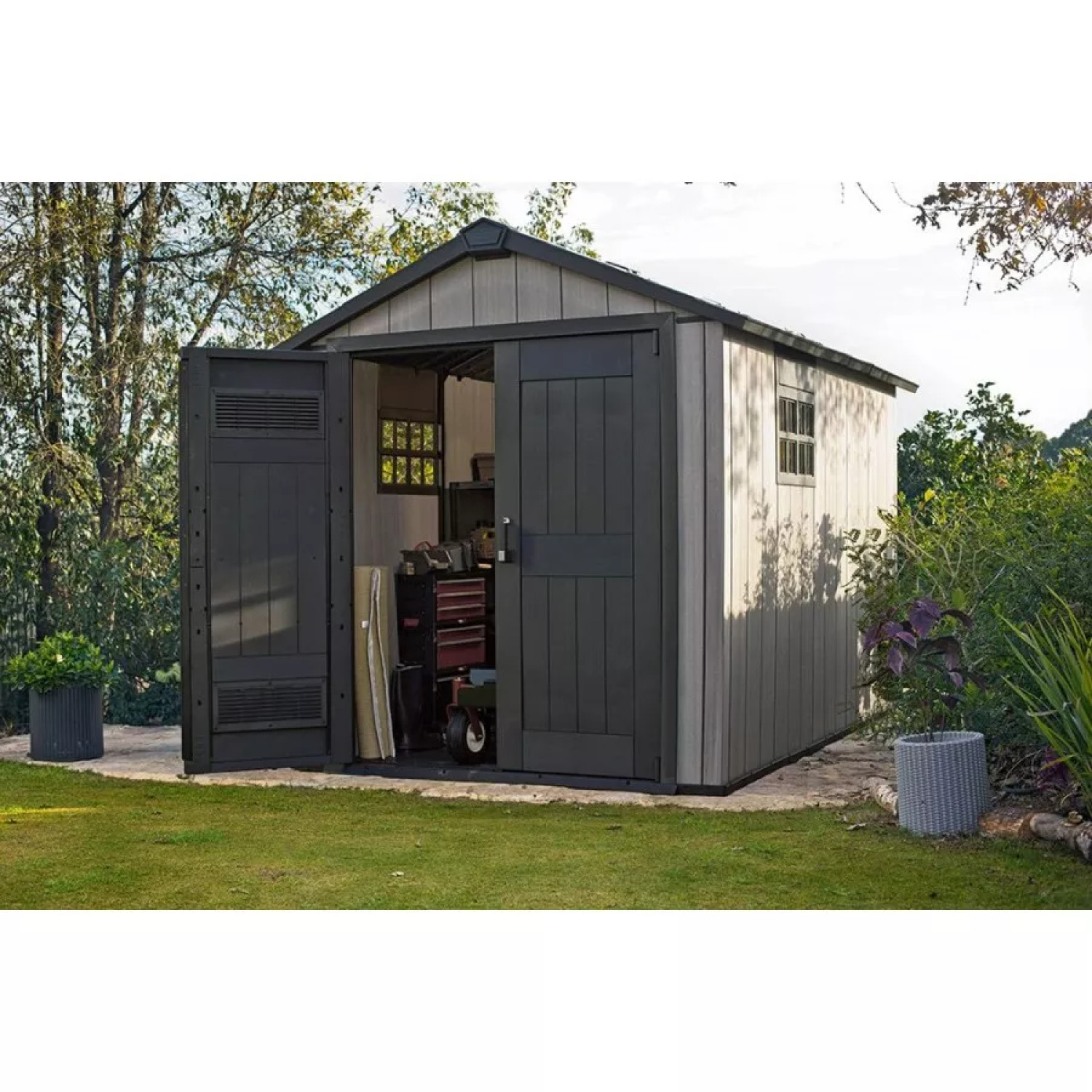Šis šķūnis ir izstrādāts, lai nodrošinātu maksimālu izturību, izmantojot sveķu kompozītmateriālu un stingru dubulto sienu struktūru. Inovatīvās DUOTECH™ sienas, kas imitē koksnes tekstūru, piešķir pievilcīgu izskatu, un tās ir viegli pielāgojamas, krāsojamas atbilstoši ainavas dizainam. Ietilpīgais šķūnis ir aprīkots ar dubultdurvīm, jumta kore ar caurspīdīgu plastikātu, kas ļauj dabīgajai gaismai iekļūt, un diviem Viktorijas stila logiem. Augsti griesti nodrošina komfortablu pārvietošanos pieaugušajiem. Montāža ir ātra un vienkārša.