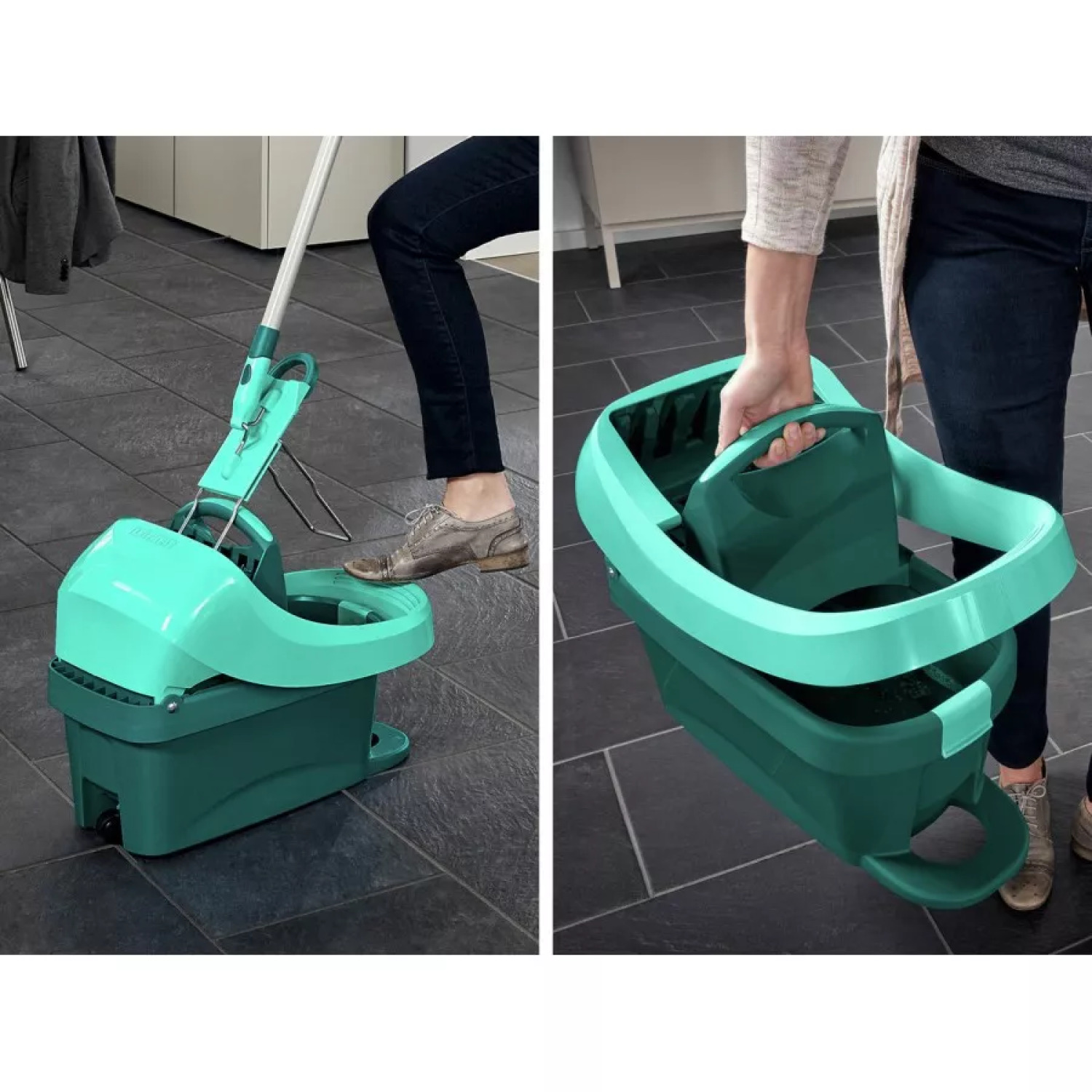 LEIFHEIT Profi XL Press grīdas uzkopšanas spainis ar ritenīšiem ir ideāls risinājums efektīvai un ērti organizētai grīdas tīrīšanai. Ar to var viegli iztīrīt grīdas un pat trepju pakāpienus.