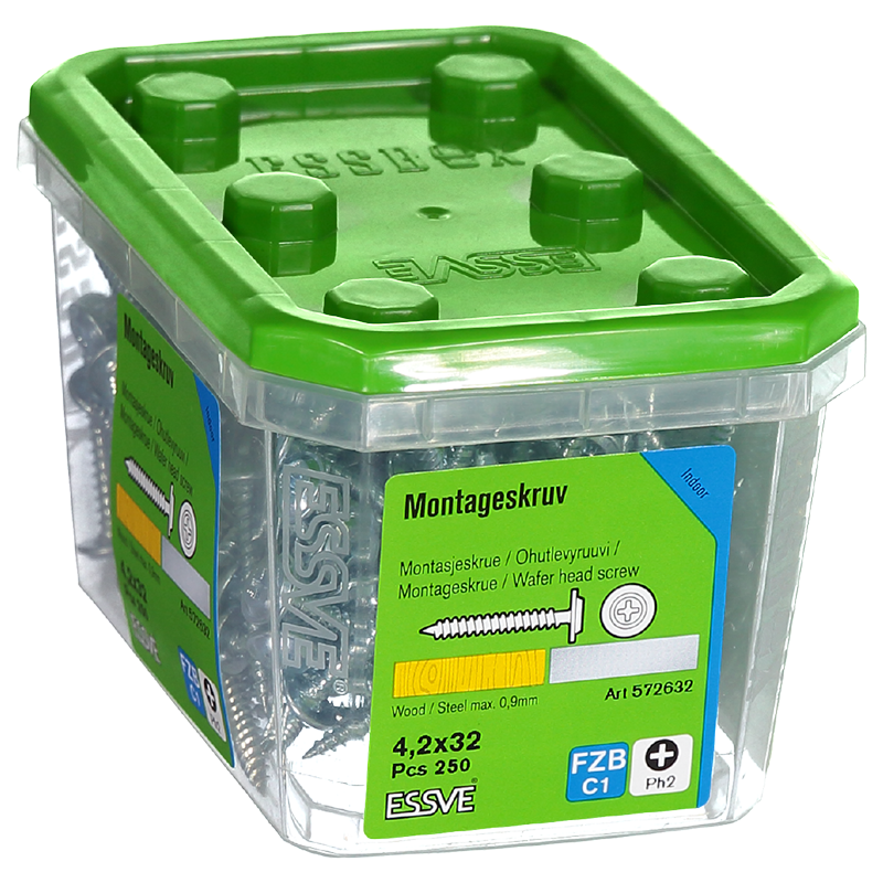 ESSVE montāžas skrūves ar smailu galu paredzētas skaidu materiālu piestiprināšanai iekštelpās pie koka un tērauda karkasa, maks. 0,4-0,9 mm.
