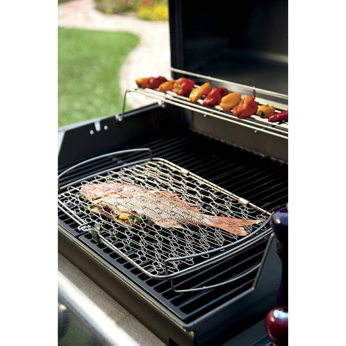 Izmantojiet šo luksusa klases grilēšanas grozu, lai perfekti un viegli pagatavotu praktiski jebko, pat sīki sagrieztus dārzeņus vai pat mazus gaļas gabaliņus. Ideāli piemērots zivs grilēšanai, turklāt šim grozam/režģim ir ērti lietojami sānu rokturi. Izgatavots no nerūsējošā tērauda. Der Q 300/3000 un lielākām gāzes griliem, kā arī lielākajai daļai ogļu griliem.