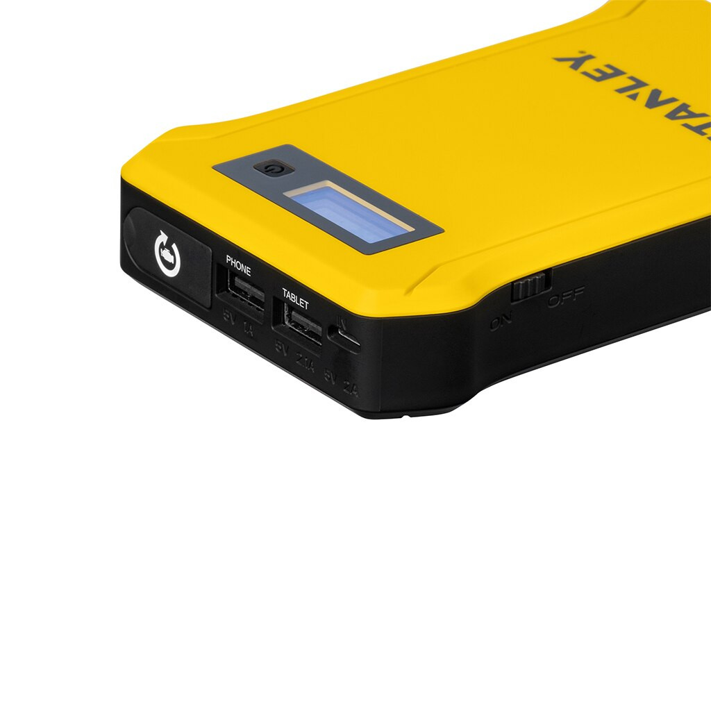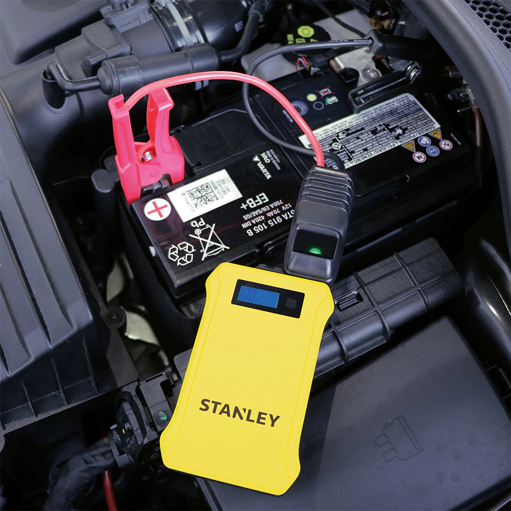 Akumulatora startēšanas ierīce ar akumulatoru baterijas stāvokļa indikatoru un izgaismotu LCD displeju.