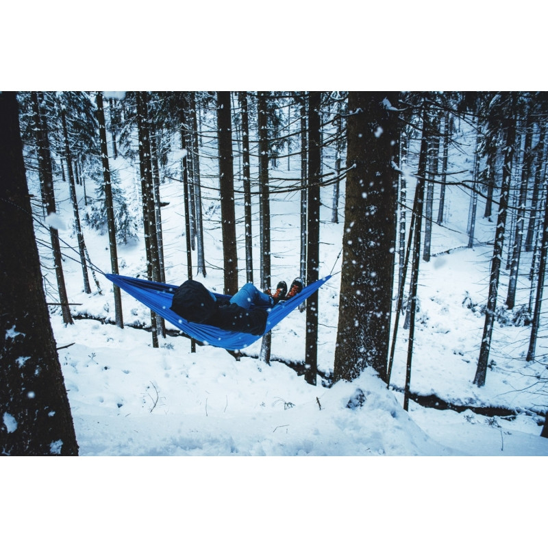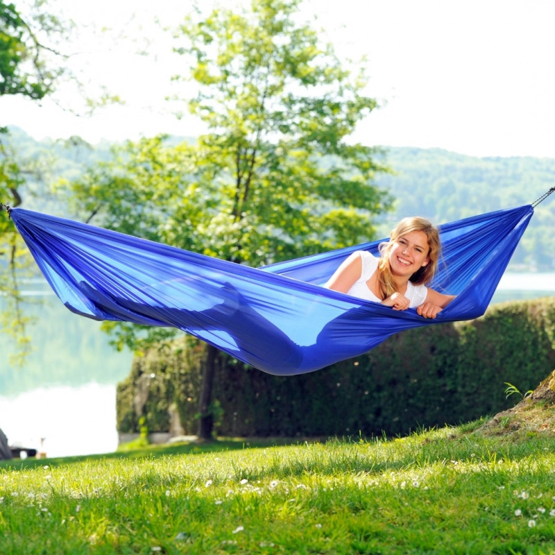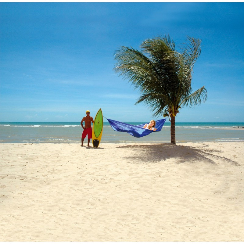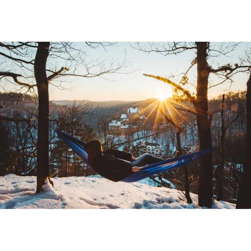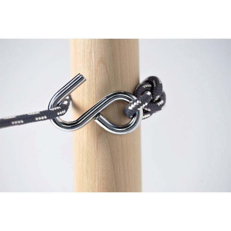 Vienkārši katrā pusē aptiniet virvi vairākas reizes ap koku un piestipriniet ar āķiem. Gatavs! Īpaši stabils, gaisa caurlaidīgs un ādai draudzīgs materiāls.