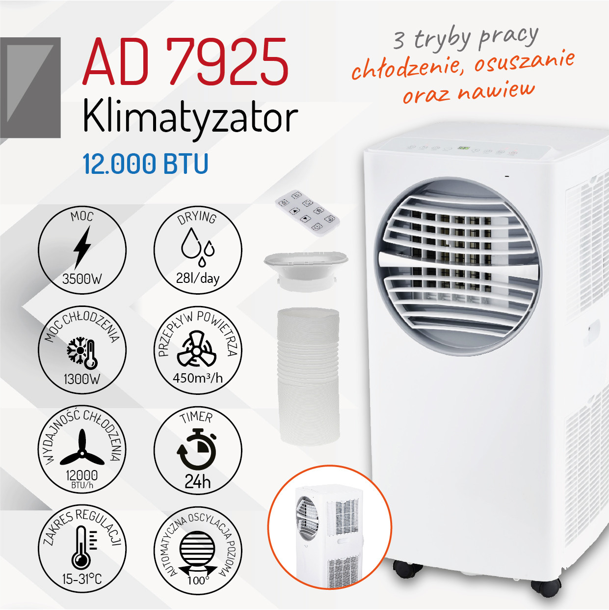 AD 7925 gaisa kondicionierim ir ventilatora gaisa padeves, dzesēšanas un sausināšanas funkcijas. Tas ir ārkārtīgi efektīvs, ar dzesēšanas jaudu 12 000 BTU. Tam ir automātiskas horizontālas svārstības funkcija, sadalot auksto gaisu 100 ° rādiusā, kas garantē vienmērīgu gaisa sadalījumu telpā. Lietošanas ērtībai gaisa kondicionieris ir aprīkots ar tālvadības pulti un taimeri, kas ļauj automātiski ieslēgt vai izslēgt noteiktā laikā. Turklāt tika izstrādāta bērnu bloķēšanas funkcija.