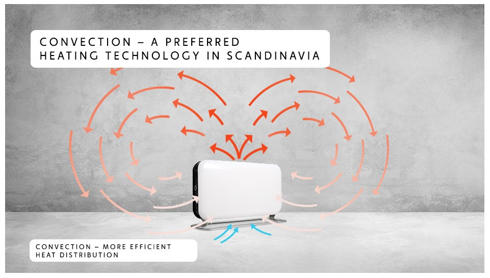 Skandināvija, kas pazīstama ar garajām ziemām un vēsu klimatu, dod priekšroku konvekcijas apkurei; auksts gaiss tiek uzkarsēts, kad tas iet caur sildelementu, karstā gaisa tilpums palielinās un palielinās, radot vietu jauna auksta gaisa ieplūšanai, efektīvi sildot telpu.