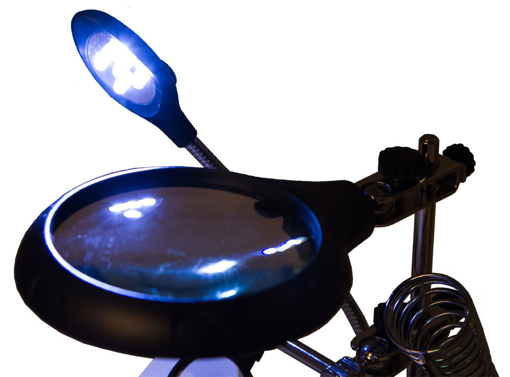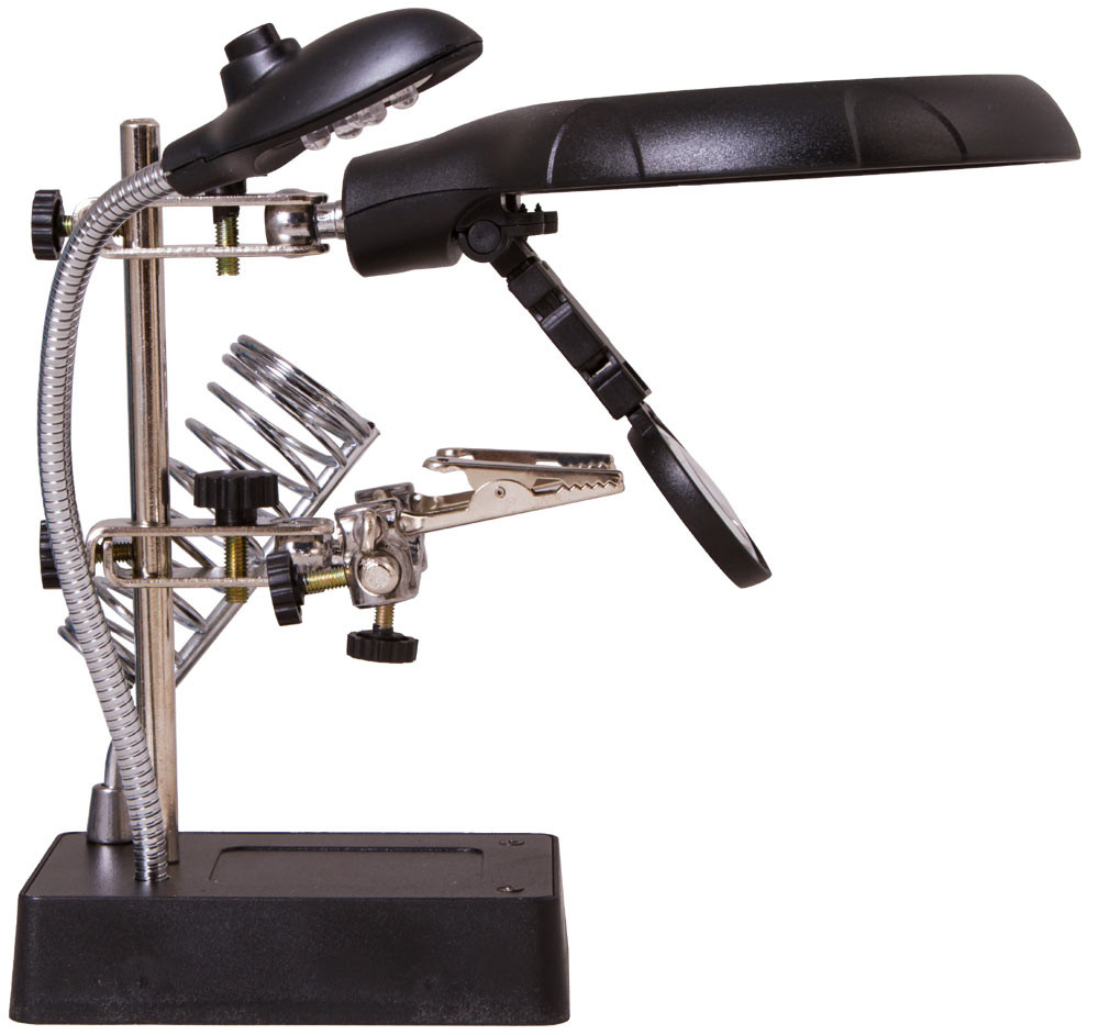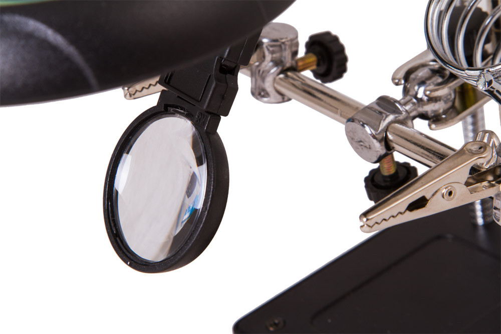 Papildus turētājs palīdzēs jums strādāt ar drukas plāksnēm vai 3D modeļiem - tas stingri fiksē objektu un atvieglo darbu ilgākā laika periodā. Palielināmais stikls ir arī speciāls turētājs lodāmurim (vajadzības gadījumā noņemams).