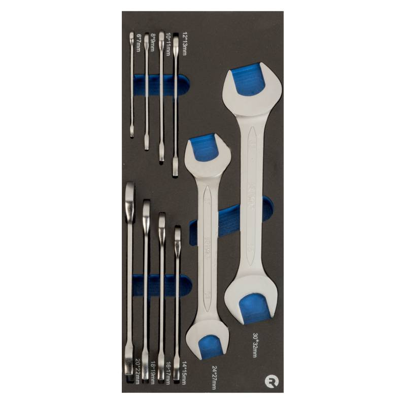 IRIMO IFF1E003 dubulto atvērtā tipa uzgriežņu atslēgu komplektā ir iekļautas 10 dažādu izmēru uzgriežņu atslēgas. Katras atslēgas izmēri ir sekojoši: 6 mm - 7 mm, 8 mm - 9 mm, 10 mm - 11 mm, 12 mm - 13 mm, 14 mm - 15 mm, 16 mm - 17 mm, 18 mm - 19 mm un 20 mm - 22 mm, 24 mm - 27 mm un 30 mm - 32 mm. Visas uzgriežņu atslēgas, kas ir izgatavotas no izturīga nerūsējošā tērauda un līdz ar to droši var apgalvot par to kalpošanu mūža garumā, ir izvietotas ieliktnī ar putu polsterējumu. Katrai uzgriežņu atslēgai ir iezīmēta sava vieta, tādēļ varat būt drošs, ka vienmēr valdīs kārtība.