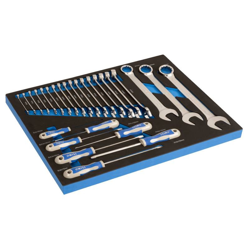 IRIMO IFF1A003 kombinēto uzgriežņu atslēgu un skrūvgriežu komplekts, kurā ir iekļautas 27 vienības. Tajā ir visu galveno izmēru kombinēto uzgriežņa atslēgu spektrs, sākot no 6 mm līdz pat 32 mm. Pavisam pieejamas 20 dažādu izmēru šī tipa atslēgas. Tāpat komplektā atradīsiet arī septiņus dažāda izmēra skrūvgriežus: pieejami četri skrūvgrieži ar rievotu asmeni (izmēri ir sekojoši: 4 mm x 100 mm, 5,5 mm x 125 mm, 6,5 mm x 150 mm, 8 mm x 175 mm), kā arī trīs PH tipa skrūvgrieži (PH 1 - 100 mm, PH 2 x 125 mm, PH 3 x 150 mm). Visi instrumenti ir izgatavoti no rūdīta tērauda, savukārt skrūvgrieži ir aprīkoti ar divkomponentu rokturiem ērtam satvērienam, ergonomiskai ērtībai darba procesā un augsta griezes momenta pārnešanai. Visi instrumenti ir izvietoti īpašā un vizuāli lieliski pārdomātā putu ieliktnī, kur katram darba rīkam ir iezīmēta sava vieta.