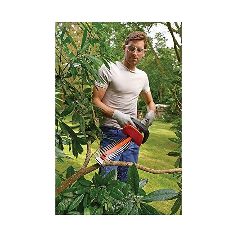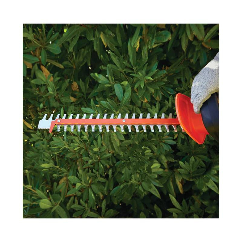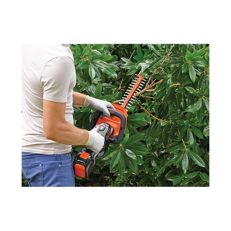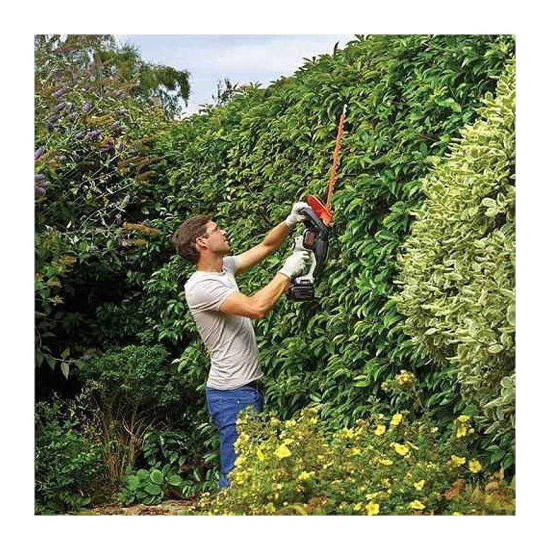BLACK DECKER GTC5455PC-QW dārza šķēres ir aprīkotas ar 54 V sprieguma 1,5 Ah litija jonu akumulatoru, kas gan komplektācijā nav iekļauts, tāpat kā lādētājs. Izmantojot BLACK DECKER POWERCOMMAND griešanas funkciju, jūs varēsiet aktivizēt lēnākus, jaudīgākus griezumus, nospiežot vien attiecīgu pogu, lai pārgrieztu biezus, cietus zarus un novērstu asmeņu iestrēgšanu. Zāģa asmens palīdzēs slīdēt cauri lapotnēm un pa ceļam apcirpt zarus, kuru platums ir līdz 38 mm. Savukārt 60 cm rūdītais tērauds ar dubultās darbības asmeni viegli pārgriezīs jebkuru dzīvžoga "mūri". Instruments ir uzticams un izturīgs, viegli lietojams, to būs viegli turēt rokās un strādāt ilgstoši, jo svars ir vien nepilni trīs kilogrami.