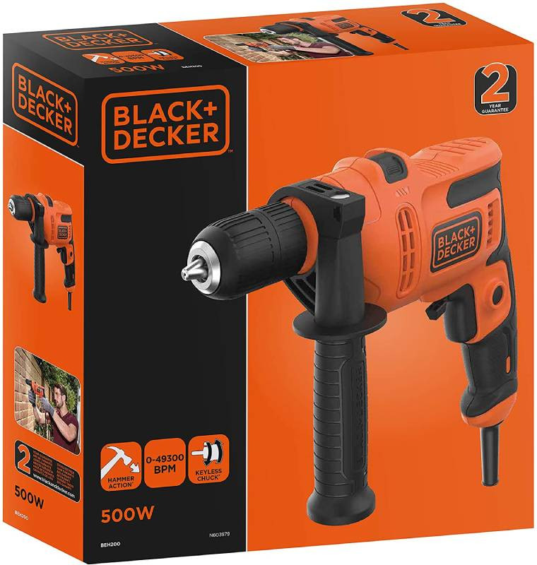BLACK DECKER BEH200-QS triecienurbjmašīna ir ar 500 W lielu jaudu, taču spēj nodrošināt līdz pat 1900 apgriezieniem minūtē, bet triecienrežīmā vai kalšanas darbos - līdz 49 300 triecieniem minūtē ar 1,6 džoulu trieciena enerģiju, kas ir īpaši svarīgi darbam ar cietiem materiāliem - betonu vai granītu. Instruments izurbs caurumu kā mūrī un betonā (līdz 13 mm), tā arī ķieģeļos vai keramiskos priekšmetos (flīzes, piemēram), tāpat arī metālā (līdz 13 mm) un kokā (līdz 20 mm). Kā augstvērtīga īpašība jāmin arī iespēja koriģēt darbības ātrumu, tāpat arī ergonomiskais gumijas rokturis optimālam komfortam un drošībai. Augstas kvalitātes SDS-Plus patrona ļauj ātri nomainīt urbju galviņas vai kaltus izmērā līdz 13 mm. Papildus pamata korpusam līdzi nākošo otru sānu rokturi varat pielāgot konkrētam turēšanas leņķim, kurā strādājat, lai iegūtu pilnīgi stabilu stāju un atbalstu. Vai arī noņemiet to pilnībā.