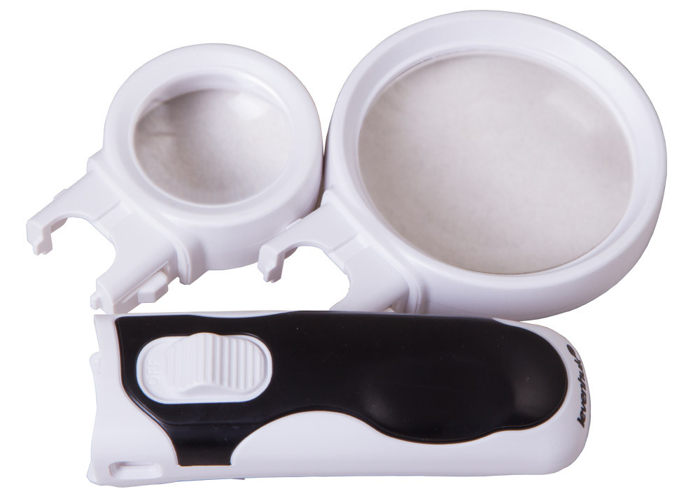 Modeļi ar divām dažāda palielinājuma un diametra lēcām, ko viegli var piestiprināt pie ergonomiskā roktura ar vienkāršu sprādzi. Izmantojiet lielu palielinājumu, lai pētītu sīkus objektus, vai mazu palielinājumu lasīšanai. LED apgaismojums ir iestrādāts rokturī, tas vienmērīgi izgaismo visu darba virsmu zem objektīva.