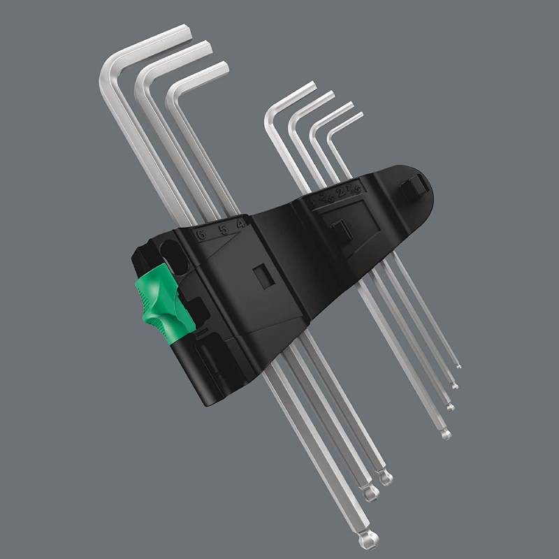 WERA 950/9 Hex-Plus 1 ir augstākās kvalitātes L veida atslēgu komplekts sešstūra ligzdas skrūvēm. Komplektā ir iekļautas deviņas atslēgas, kas ietvertas praktiskā klipša stiprinājumā no nodilumizturīga materiāla. Tas nodrošina gan drošu glabāšanu, gan arī darbu uzsākot tās viegli un bez piepūles noņemt no stiprinājuma. Atslēgas ir ar HEX-Plus profilu un nodrošina lielāku saskares virsmu skrūves galviņā. Tas samazina iegriezuma efektu līdz minimumam un gandrīz pilnībā novērš skrūves padziļinājuma sabojāšanas risku. Garā laidiena lodveida gals nodrošina uzticamu darbu pat sarežģītās situācijās. Precīza hromētā tērauda konstrukcija savukārt nodrošina augstu aizsardzību pret koroziju. Jūs arī ātri varēsiet noorientēties brīdī, kad jāizvēlas pareizā atslēga - uz katras ir ar lāzeru iegravēti parametri.