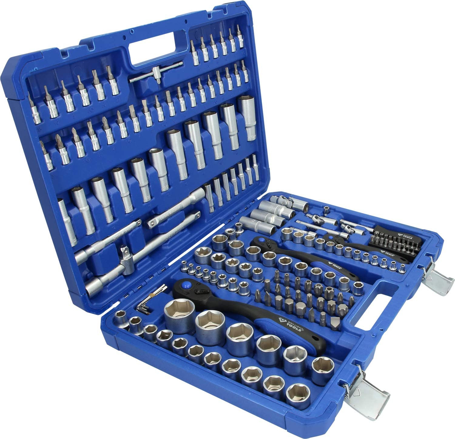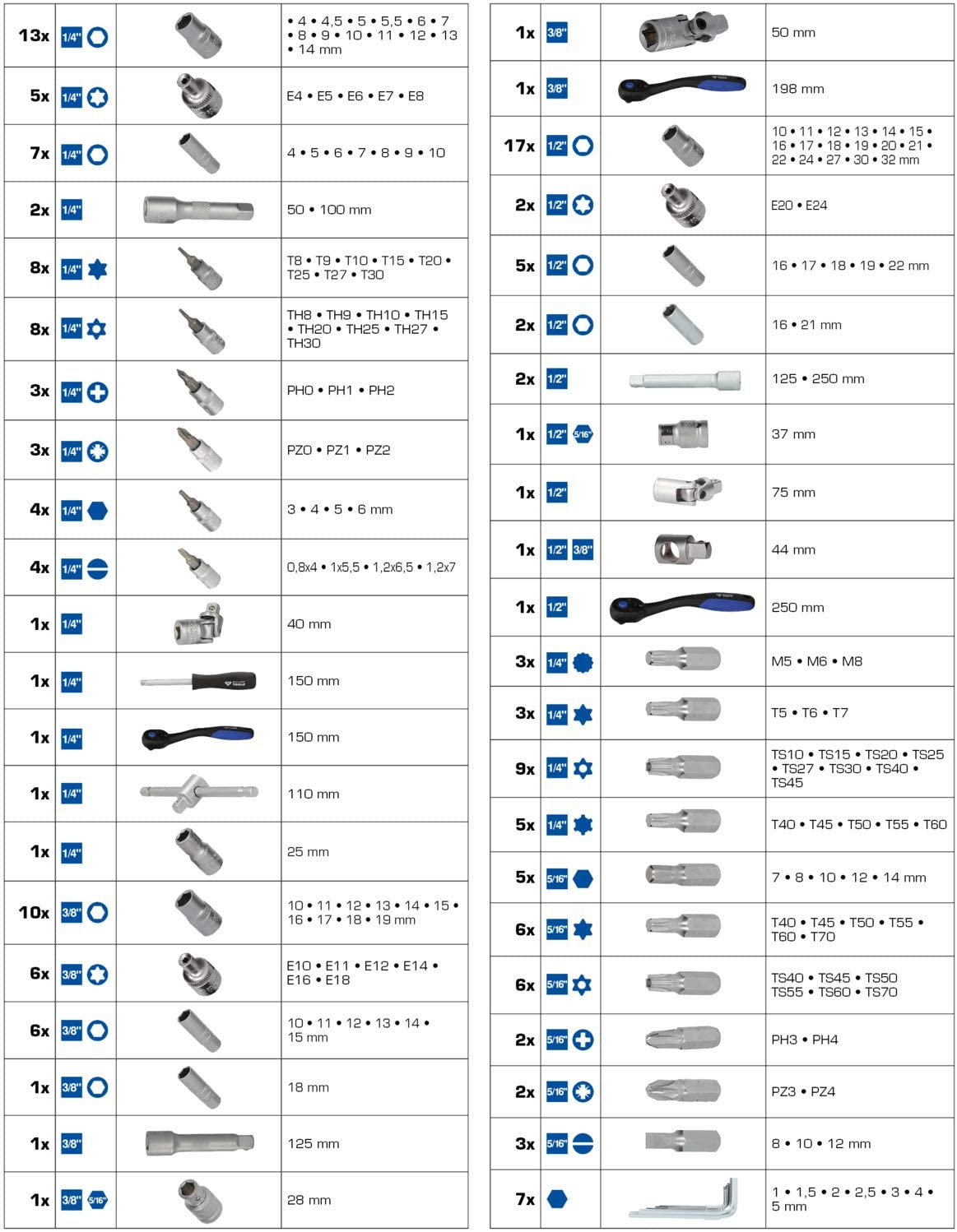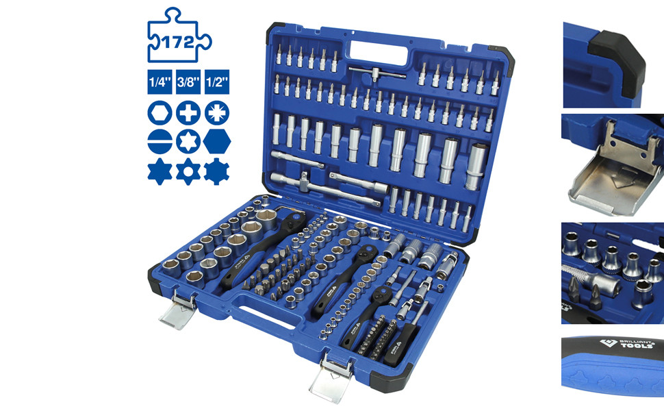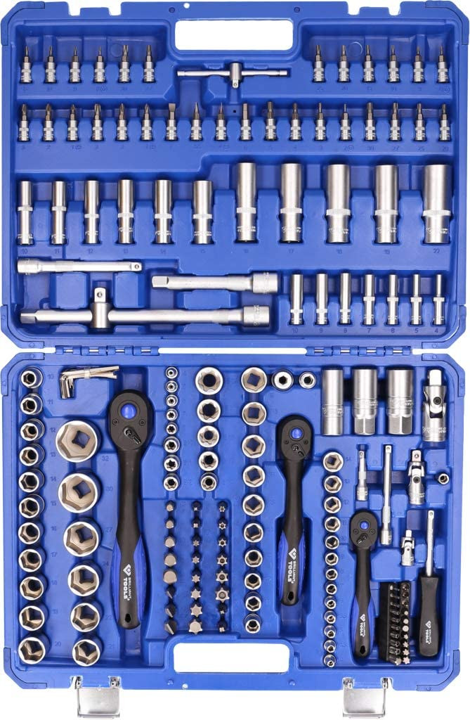 Komplektā ir 1/4" 3/8" un 1/2 reversās sprūdratu atslēgas ar adapteriem un pagarinājumiem.