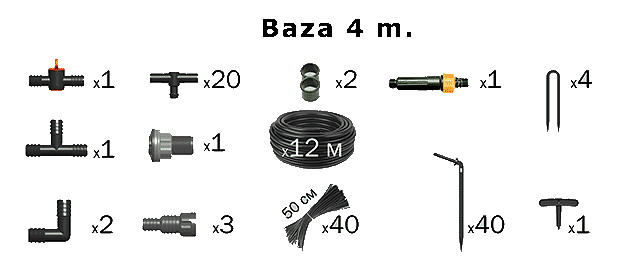 Laistīšanas sistēmas VODOMERKA pamata komplekts paredzēts divām dobēm, katra 4 metrus gara.