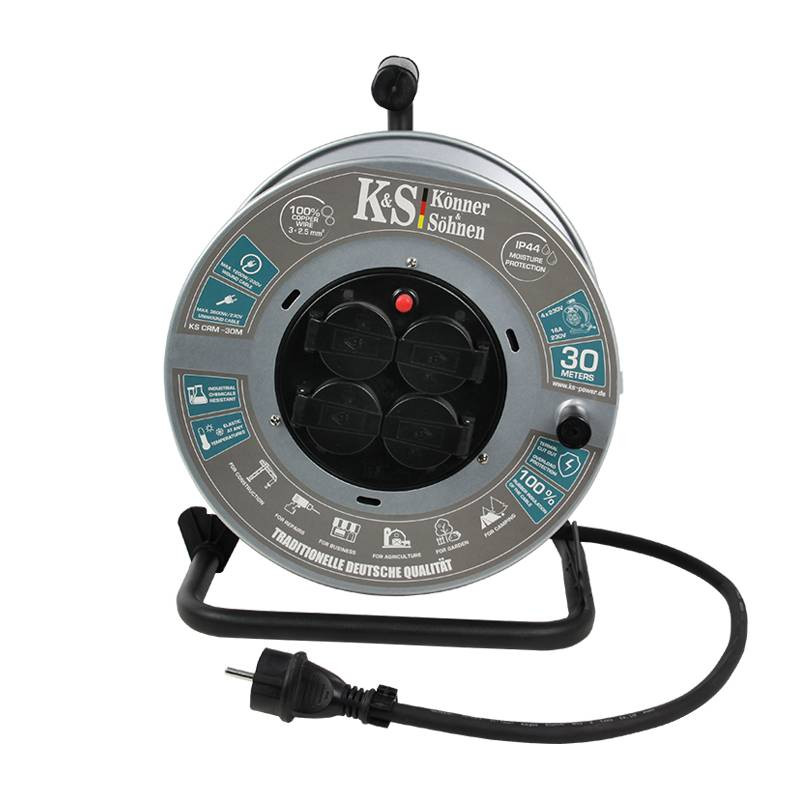 Pagarinātājs ar spoli KONNER & SOHNEN KS CRM-30M ir ar vada garumu 30 metri, piemērots līdz 4 elektroierīču attālinātai pieslēgšanai vienlaicīgi pie 230 V tīkla (ar kopējo jaudu līdz 3600 W). Tam ir IP44 aizsardzības klase, kas ļauj pagarinātāju izmantot ārpus telpām brīvā dabā un zem klajas debess, pat lietus un sniega apstākļos - laika apstākļi tā darbību nekā neietekmēs. Kontaktligzdas ir aprīkotas ar aizsargvāciņiem. Pagarinātāju var izmantot celtniecības un remonta darbos, lauksaimniecībā, rūpnīcās un noliktavās. Būs uzticams palīgs arī tad, ja ņemsiet līdzi ceļojot, nakšņojot kempingā vai laukos.