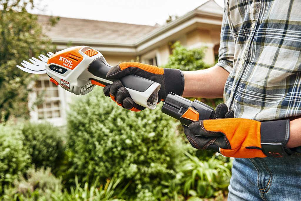 Vieglas un kompaktas akumulatora krūmu šķēres ar krūmu asmeņiem nelielu dzīvžogu un dekoratīvo koku apgriešanai un kopšanai.