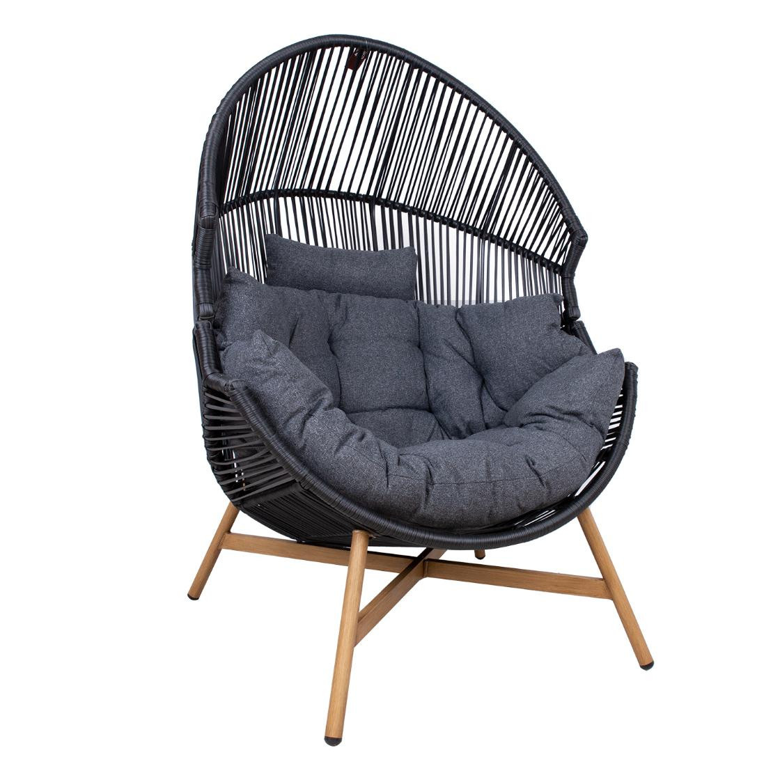 Krēsla sēdekļa spilveni ir pārklāti ar tumši pelēku poliestera audumu.