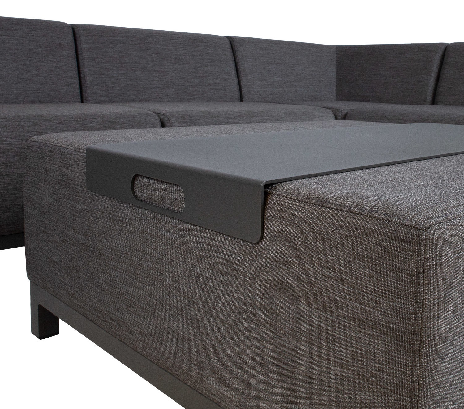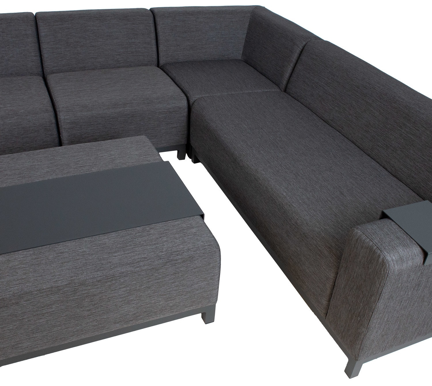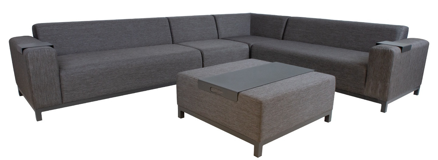 Komplektā ietilpst četrdaļīgs moduļu dīvāns un pufs/galds. Dīvāna moduļu izkārtojumu var mainīt pēc vēlēšanās. Visu komplekta daļu pamatnes rāmji ir izgatavoti no alumīnija un pārklāti ar pelēku tekstila un olefīna audumu. Dīvāna moduļu izmēri: divvietīgs modulis ar labo/kreiso roku balstu (2gab.) 162x82x68cm, stūra modulis 84x84x68cm, vienvietīgs modulis bez roku balstiem 69x74x68cm. Sēdekļa augstums 40cm, sēdekļa dziļums 58cm. Atzveltnes augstums 33cm. Roku balsta augstums no zemes 57cm, roku balsta platums 22cm. Pufa/galda izmēri ir 87x87x39cm. Komplektā ietilpst 2 metāla paliktņi dīvāna roku balstiem un viens paliktnis novietošanai uz pufa. Palikņu izmēri ir 20x22,5cm un 40x90cm. Pateicoties inovatīviem materiāliem, dīvāns ir izturīgs pret mainīgiem laikapstākļiem un ir viegli kopjams.