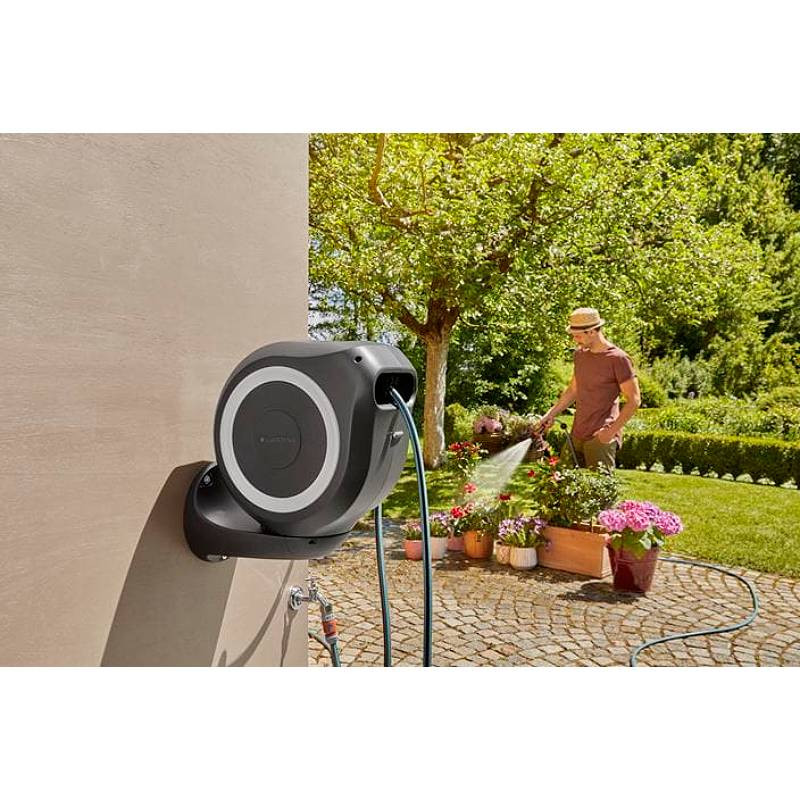 GARDENA RollUp M ir dārza laistīšanas šļūtenes sistēma, kas ir piestiprināma pie sienas. Šis modelis ir ar 20 m garu šļūteni. Praktiskā šļūtenes glabātuve ir vienkārši uzmontēta uz jūsu mājas sienas un savienota ar ūdens krānu ar elastīgu savienojošo šļūteni. Pateicoties izturīgajam sienas kronšteinam, šļūtenes sistēmu var pagriezt par vairāk nekā par 180 grādiem, lai jūs bez piepūles varētu sasniegt katru dārza stūri. Šļūtene automātiski nofiksējas īpaši īsos intervālos, tiklīdz jūs apstāsieties. Viegli pavelkot šļūtenes galu, tiek atbrīvots aizslēgs. Šļūtenes spole ir izturīga gan pret ultravioleto starojumu, gan pret salu, un to var atstāt uz mājas sienas visu gadu.