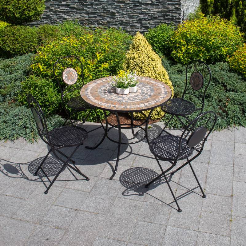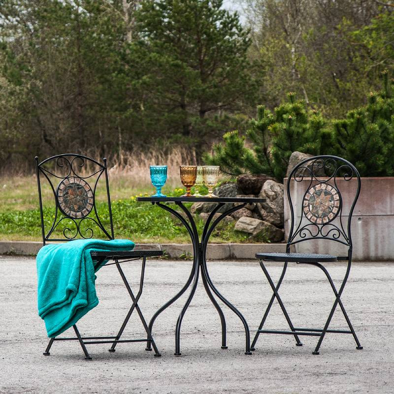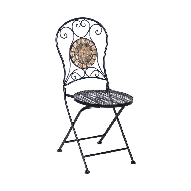 Krēsls MOSAIC ir salokāms, tādējādi tā nelietošanas laikā aizņemot pavisam nedaudz vietas telpā. No metāla. Vizuāli ļoti pievilcīgs sava interesantā dizaina labad un mozaīkas veidojumiem atzveltnē. Krēslu iespējams kombinēt ar tāda paša stila galdiem (kodi 38664, 38668). Krēsla atzveltne un sēdeklis ir apaļi. Svara ierobežojums ir 90 kg.