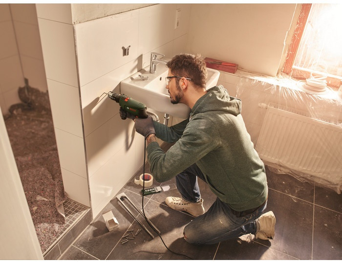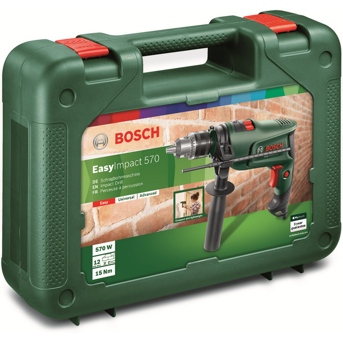 Ērts un kompakts instruments ērtai urbšanai vairākos materiālos Zobaploces urbjpatrona stingrai urbju fiksācijai Ar gaili iedarbināma Bosch Electronic Ātruma Regulēšana urbšanas laikā Mazs 1,7 kg svars, kompakta un ergonomiska konstrukcija ērtai lietošanai Viegla urbšana līdz pat 12 mm biezajā mūrī un līdz pat 25 mm biezajā kokā Lieliski piemērots iesācēju standarta mājas un dārza urbšanas darbu vajadzībām Lieliski piemērots ērtai, vieglai un precīzai urbšanai vairākos materiālos EasyImpact 570 sniedz ērtu un vieglu urbšanu vairākos materiālos. Būdams viegls, kompakts un jaudīgs, ar ātru un vieglu urbju instrumentu nomaiņu un automātiski kontroltralējumu urbšanas ātrumu, šis triecienurbjmašīna ir lieliski piemērota darbiem ar mūriem, koku un mīkstu cementu. EasyImpact 570 sniedz ērtu urbšanu mūros, kokā, metālā un mīkstajā cementā. Bezatslēgas urbjpatrona ar Autolock sniedz ātru uzgaļu nomaiņu ar vienu roku, jo urbja vārpsta automātiski nofiksējas stingrā pozīcijā. Tas ir aprīkots ar Bosch Electronic Ātruma Kontroli, nodrošinot pareizu ātrumu materiāliem, izmantojot spiedienjūtīgu sensoru. Tam ir ergonomisks dizains, tas sver tikai 1,6 kg un tas sniedz vieglu urbšanu virs galvas. 570 W motors nodrošina uzticamus rezultātus vairākos materiālos, nodrošinot urbšanas dziļumu līdz pat 12 mm mūrī un līdz pat 25 mm kokā.