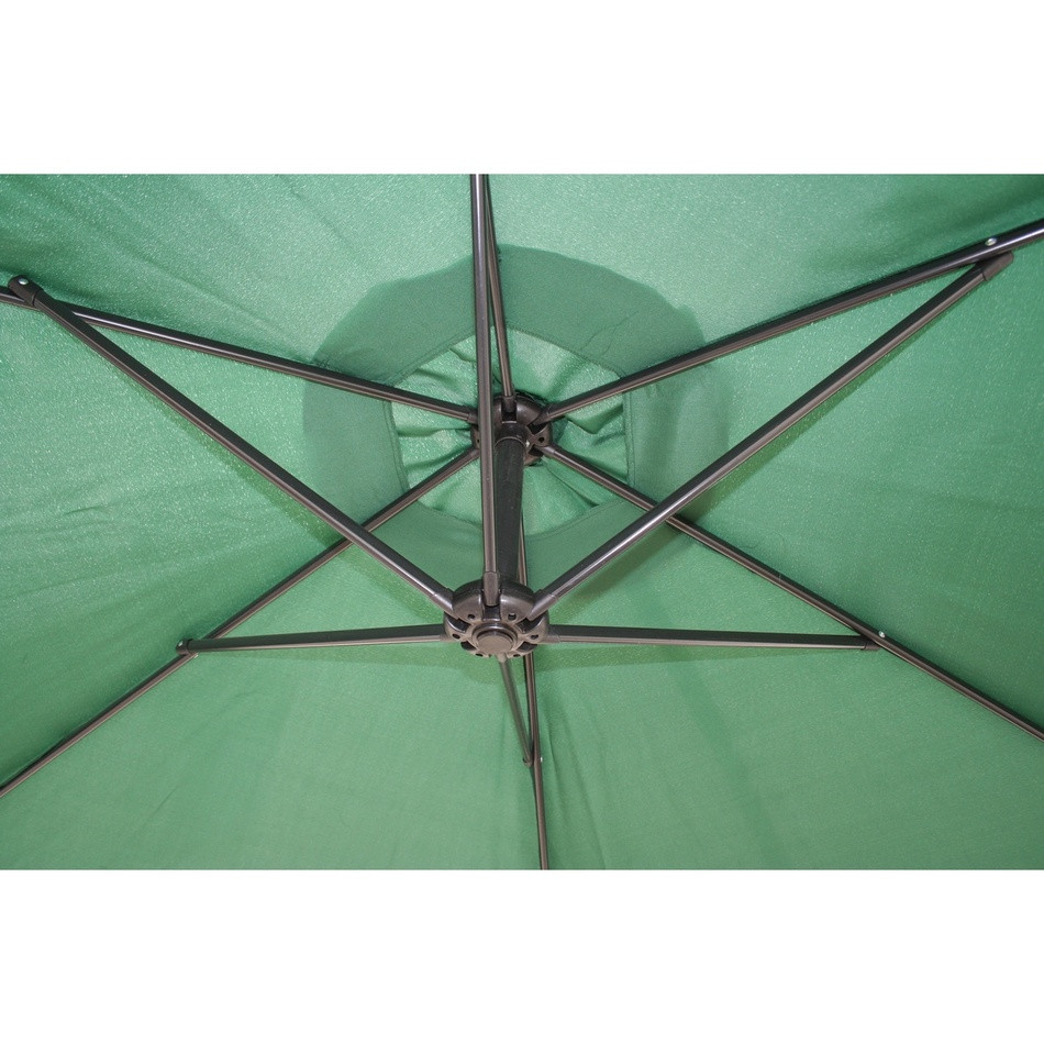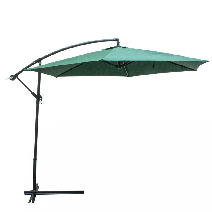 Saulessargs ar diametru 3m, tumši zaļš poliestera pārvalks 160g / m2. Ciets tērauda stienis ar diametru 48 mm. Statīvu var noslogot ar betona flīzēm, lai palielinātu kopējo stabilitāti. Saulessargs atverams ar rokturi.