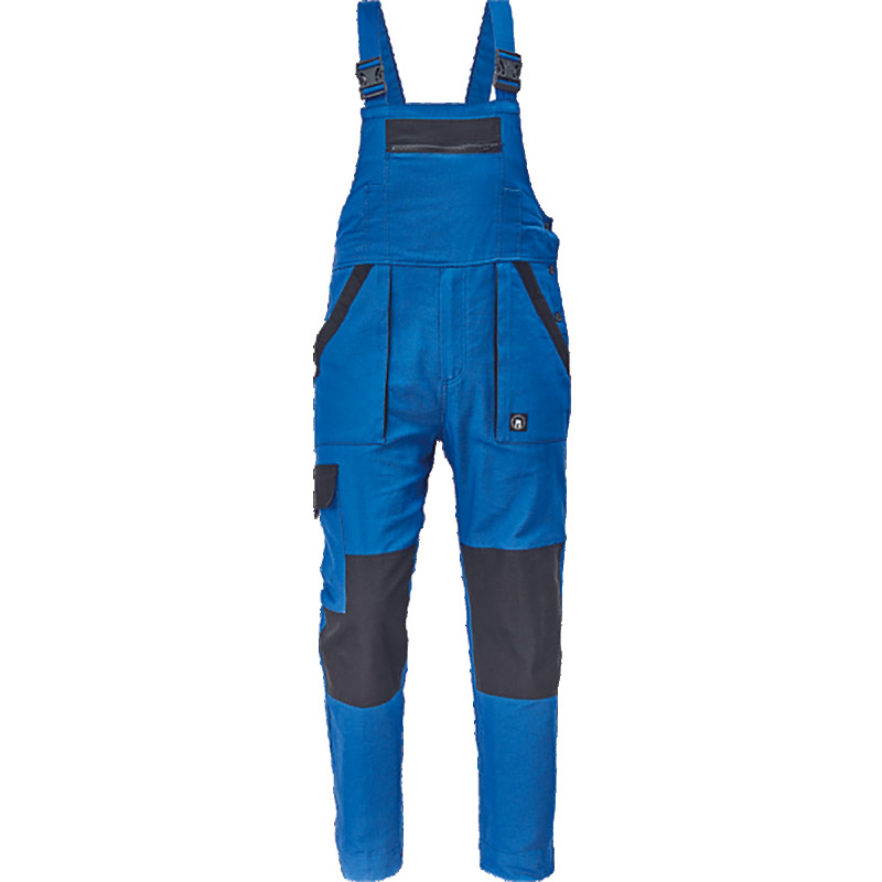 MAX NEO darba puskombinezons zils/melns, vīriešu darba puskombinezons ar elastīgu jostasvietu; platām lencēm ar plastmasas sprādzēm; 2 sānu kabatas, 1 augšstilba kabata; 1 liela krūšu kabata, 2 aizmugurējās kabatas; atstarojošas svītras apakšējās kājas daļās; ceļa daļu pastiprināšana.