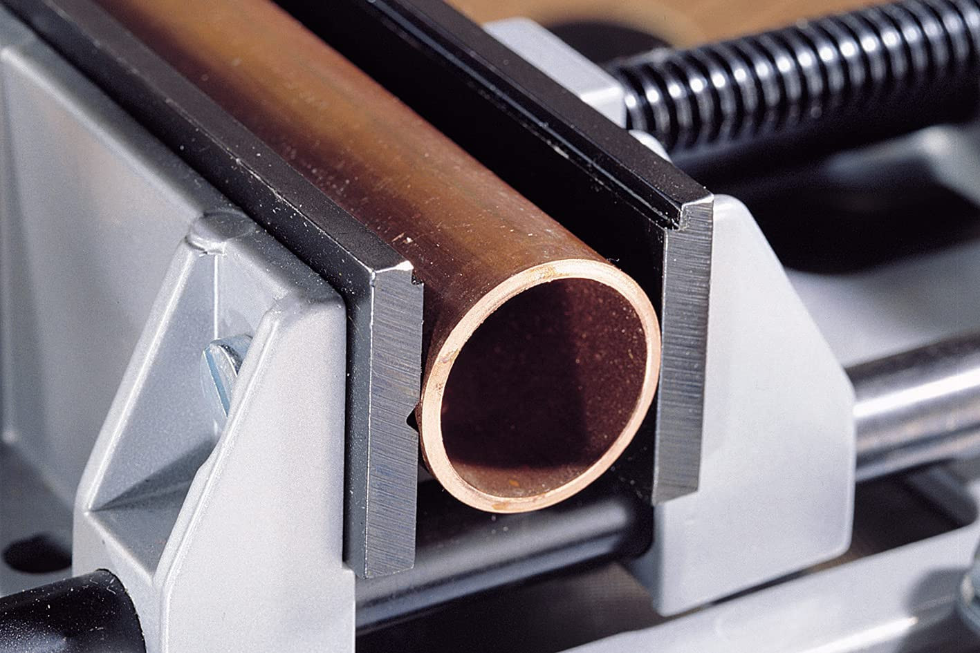 Skrūvspīles iespīlēšanas žokli aprīkoti ar horizontālām un vertikālām V veida rievām apaļa materiāla iespīlēšanai.
