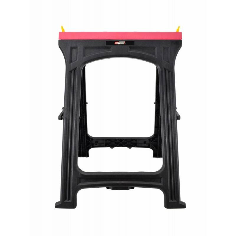AWTOOLS atbalsta kāju komplekts darba galda izveidei un zāģēšanai. Komplektā ir divas salokāmas kājas: saliektā veidā platums ir 4,8 cm, atvērtā - 54 cm. Izgatavotas no izturīgas plastmasas, ar 300 kg kravnesību. Integrētas rievas materiāla iespīlēšanai un noturēšanai vietā zāģēšanas laikā. Apakšējo daļu var izmantot kā plauktu materiāliem, instrumentiem u.c., vienlaikus nodrošinot statīvu stabilitāti. Iebūvēta lineārā mērīšanas skala.