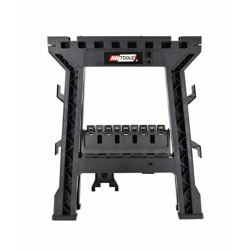 AWTOOLS atbalsta kāju komplekts darba galda izveidei un zāģēšanai. Komplektā ir divas salokāmas kājas: saliektā veidā platums ir 7 cm, atvērtā 35 cm. Izgatavotas no izturīgas plastmasas, ar 450 kg kravnesību. Integrētas rievas materiāla iespīlēšanai un noturēšanai vietā zāģēšanas laikā. Apakšējo daļu var izmantot kā plauktu materiāliem, instrumentiem u.c., vienlaikus nodrošinot statīvu stabilitāti.