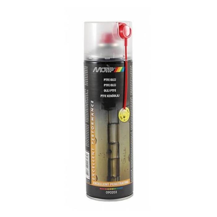 MOTIP PTFE SPRAY 500 ml flakonā ir berzi mazinoša teflona smērviela. Teflona daļiņas ir samaisītas ar eļļu, kas lieliski palīdz smērvielai iekļūt starp dažādām virsmām, veidojot īpaši plānu smērvielas kārtiņu. Smērviela ir ļoti stabila un spej izturēt lielu mehānisko slodzi no -50 līdz +250 grādu temperatūrā. Paredzēta lietošanai putekļainā vidē un plašā temperatūras diapazonā. Piemērota plastmasas un metāla detaļu eļļošanai, piemēram, slēdzenēm, bīdāmajām virsmām, smalkiem mehānismiem, kabeļiem, buksēm, gultņiem, durvju eņģēm. Var izmantot arī divriteņu ķēdes eļļošanai. Smērviela vienmērīgi ieeļļo ķēdi visā tās garumā.
